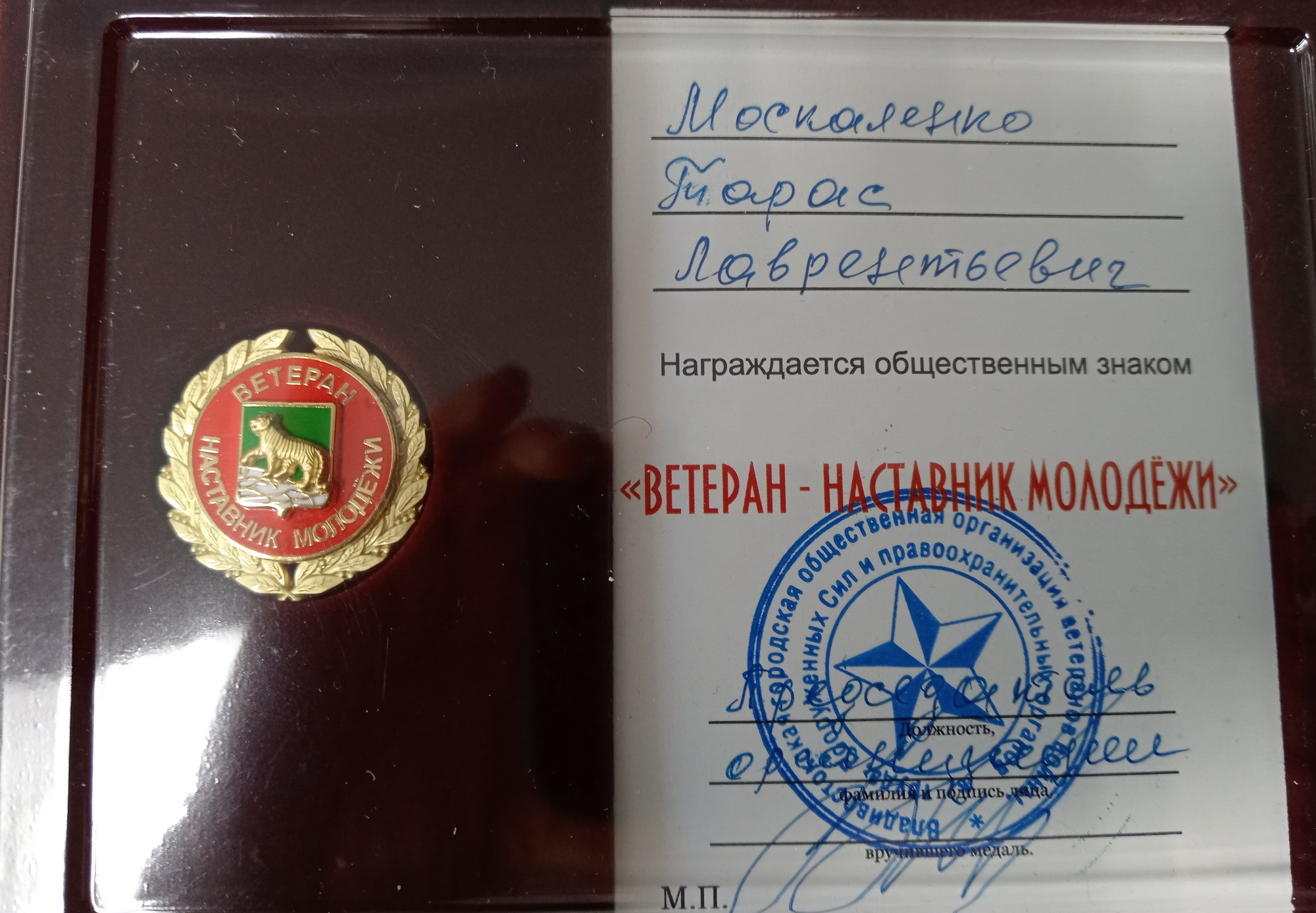 Членам Совета Тарасу Москаленко и Михаилу Романкевичу были вручены нагрудные знаки «Ветеран – наставник молодежи».