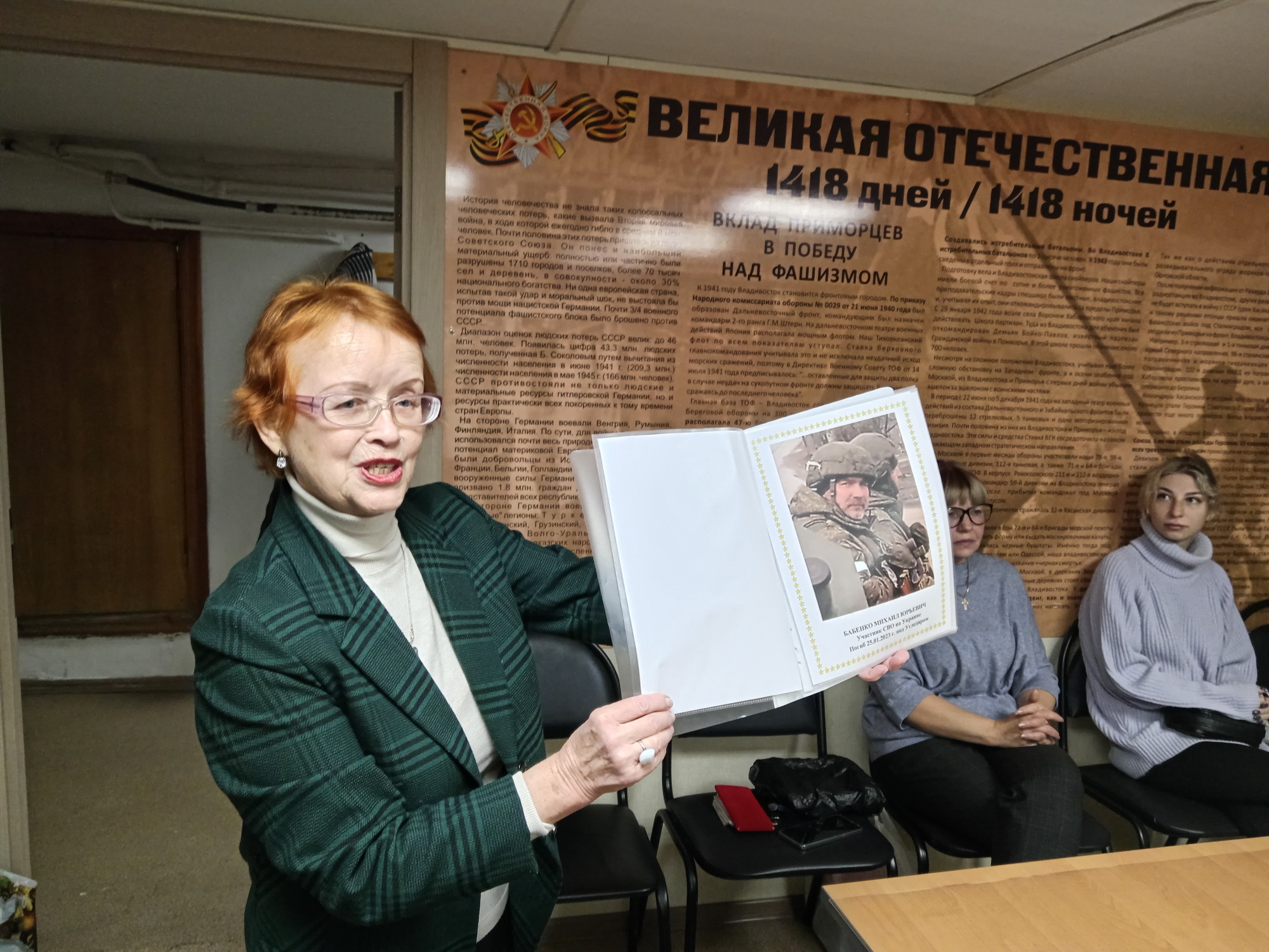 Для открытия в Центре патриотического воспитания стенда «Герои СВО» на заседание были приглашены вдова и дочь Героя Специальной военной операции Михаила Бабенко. Анжела Бабенко рассказала о судьбе и подвиге мужа, член Совета Татьяна Денисенко прочитала свои стихи, посвященные Защитникам Отечества. Память о павших почтили минутой молчания.