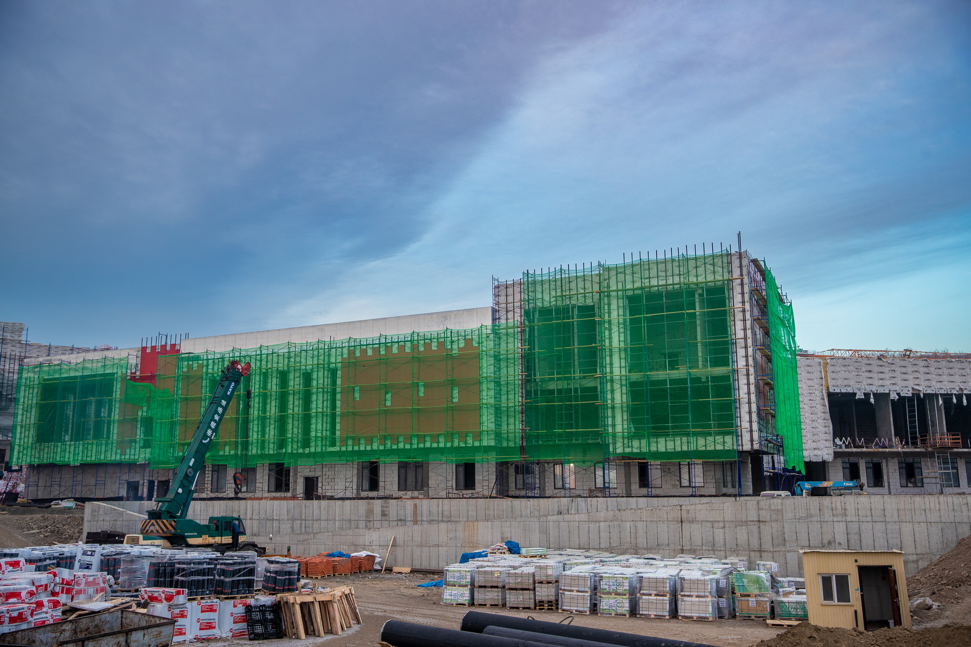 Весной, когда установятся постоянные положительные температуры, на территории начнется благоустройство. Здесь появится стадион и несколько спортплощадок, а уже сейчас устанавливают ограждение. В ближайшее время строители должны приступить к монтажу витражных окон в основном корпусе, где будут бассейн, спортзал, библиотека и другие помещения. Впереди также закупка оставшегося оборудования для кухни и бассейна. Лифтовое оборудование уже закуплено и ждет установки.