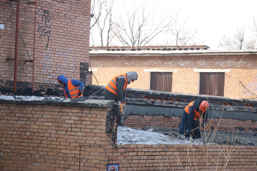 Первым объектом осмотра стал детский сад на улице Постышева,7. В настоящее время объект огорожен забором, на территории работает техника, ведутся работы по ремонту кровли.