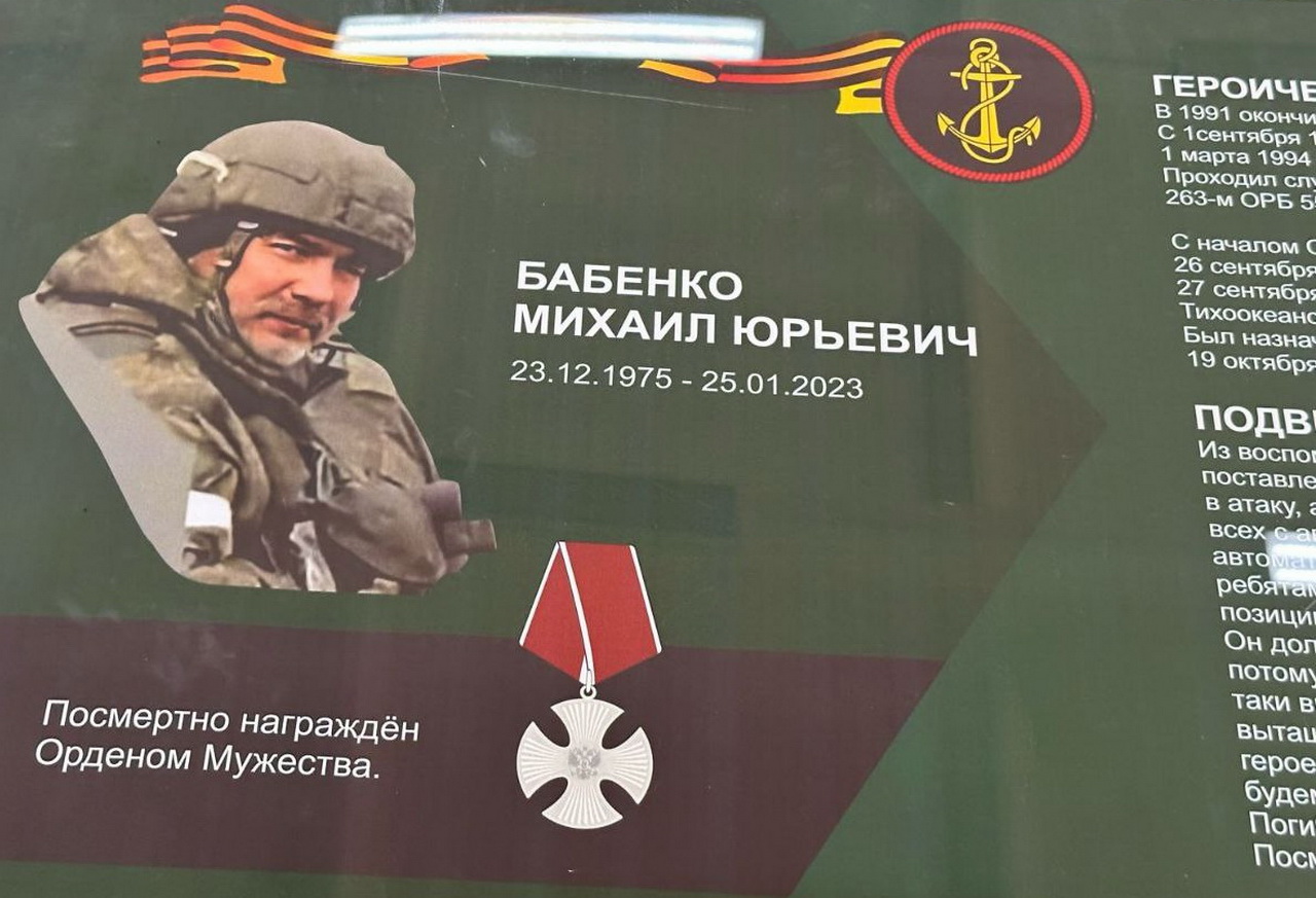 Бабенко Михаил Юрьевич (23.12.1975-25.01.2023) ― гвардии сержант 155-й отдельной гвардейской ордена Жукова бригады морской пехоты ТОФ, погиб в бою под Угледаром в ходе проведения Специальной военной операции.