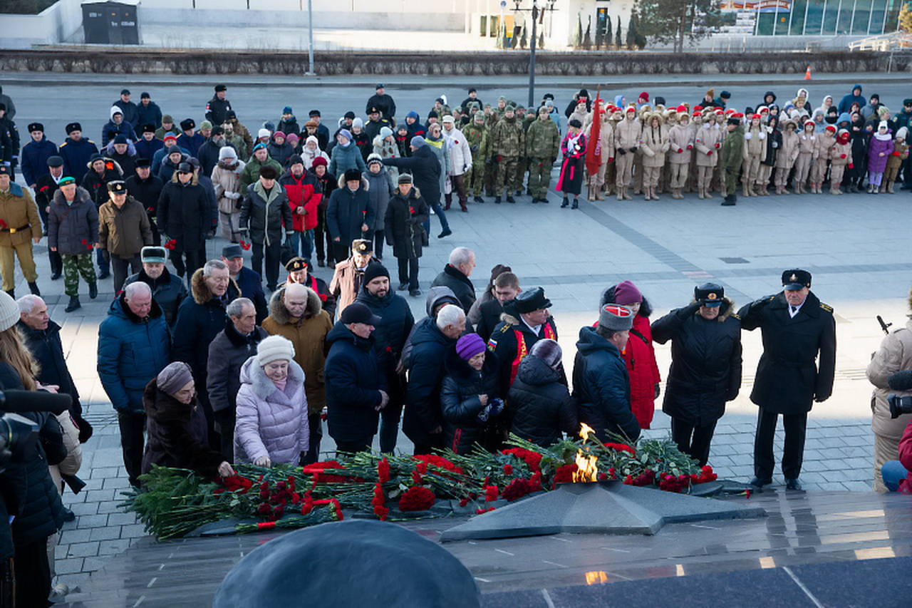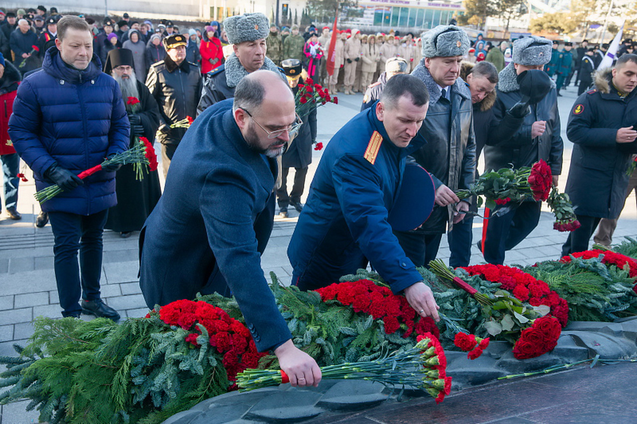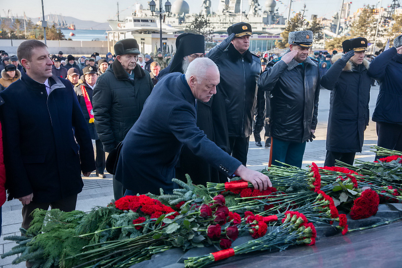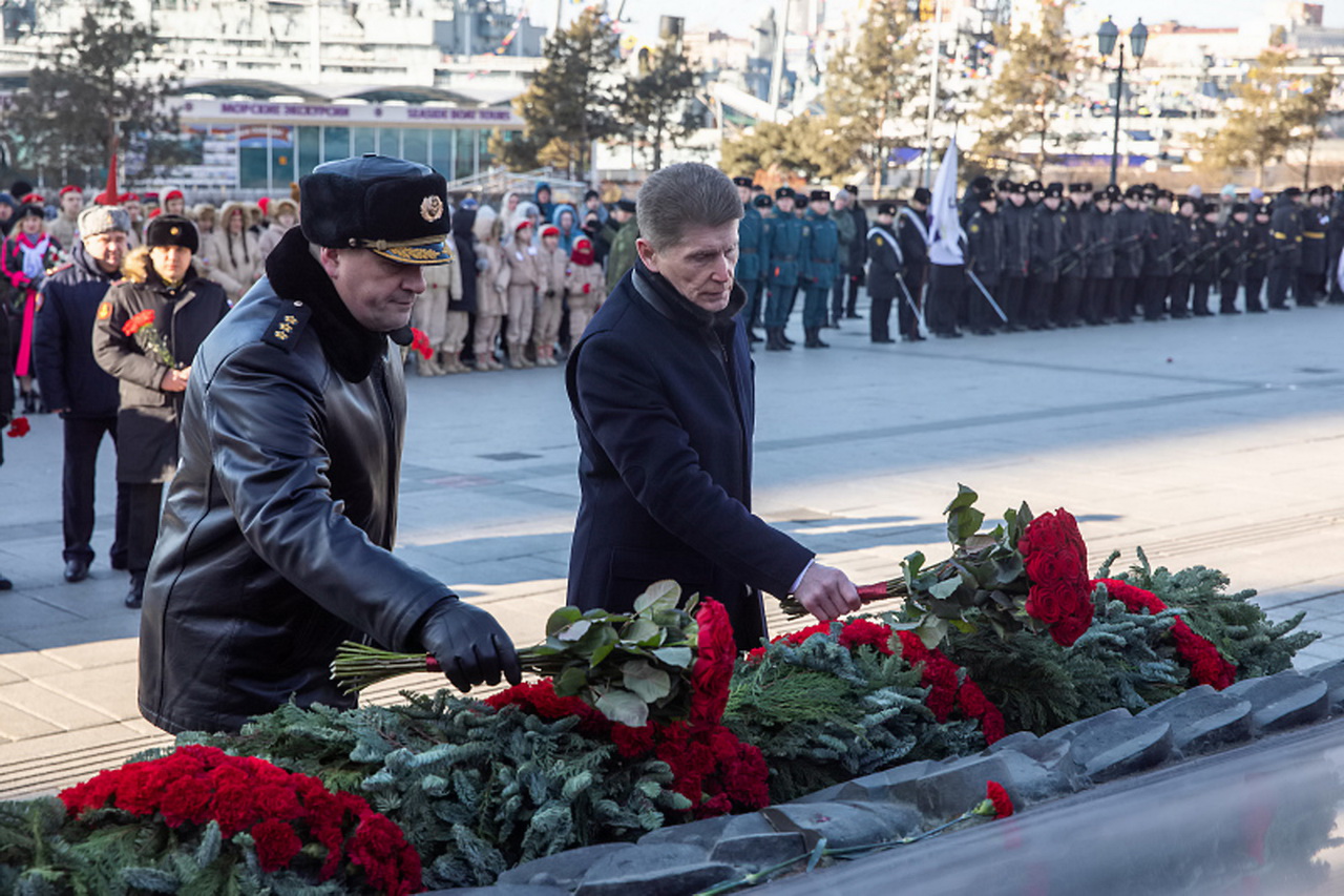 В День защитника Отечества состоялось возложение гирлянды и цветов к Вечному огню Мемориального комплекса «Боевая слава ТОФ». В торжественной церемонии приняли участие Губернатор Приморского края Олег Кожемяко, командующий ТОФ Виктор Лиина, председатель Законодательного Собрания Приморского края Антон Волошко, глава города Владивостока Константин Шестаков, председатель Думы города Владивостока Андрей Брик, депутаты, военнослужащие ТОФ, представители ветеранских организаций, курсанты, воспитанники военно-патриотических клубов. Участники мероприятия почтили память защитников Отечества минутой молчания.