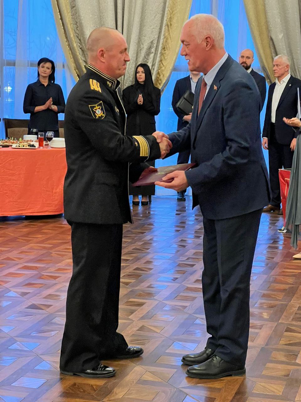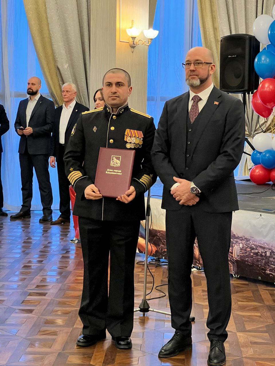 В честь защитников Отечества в городе состоялся офицерский бал. Председатель Думы Владивостока Андрей Брик, руководитель фракции «Единая Россия» в Думе Евгений Недбай, председатель комитета по молодежной политике, физической культуре и спорту Думы Мария Лагунова вручили военнослужащим, участникам Специальной военной операции и ветеранам локальных войн награды Думы за проявленное мужество и самоотверженность, высокий профессионализм при исполнении служебного и гражданского долга.