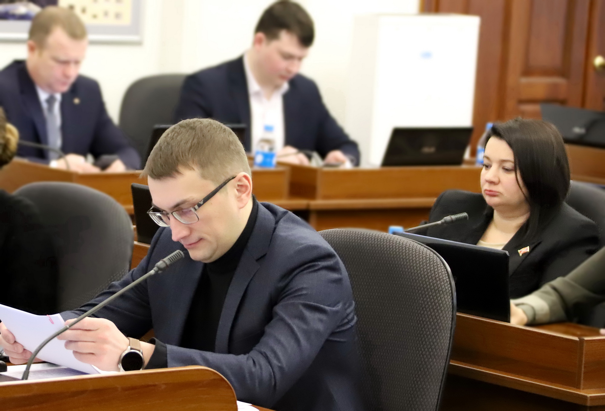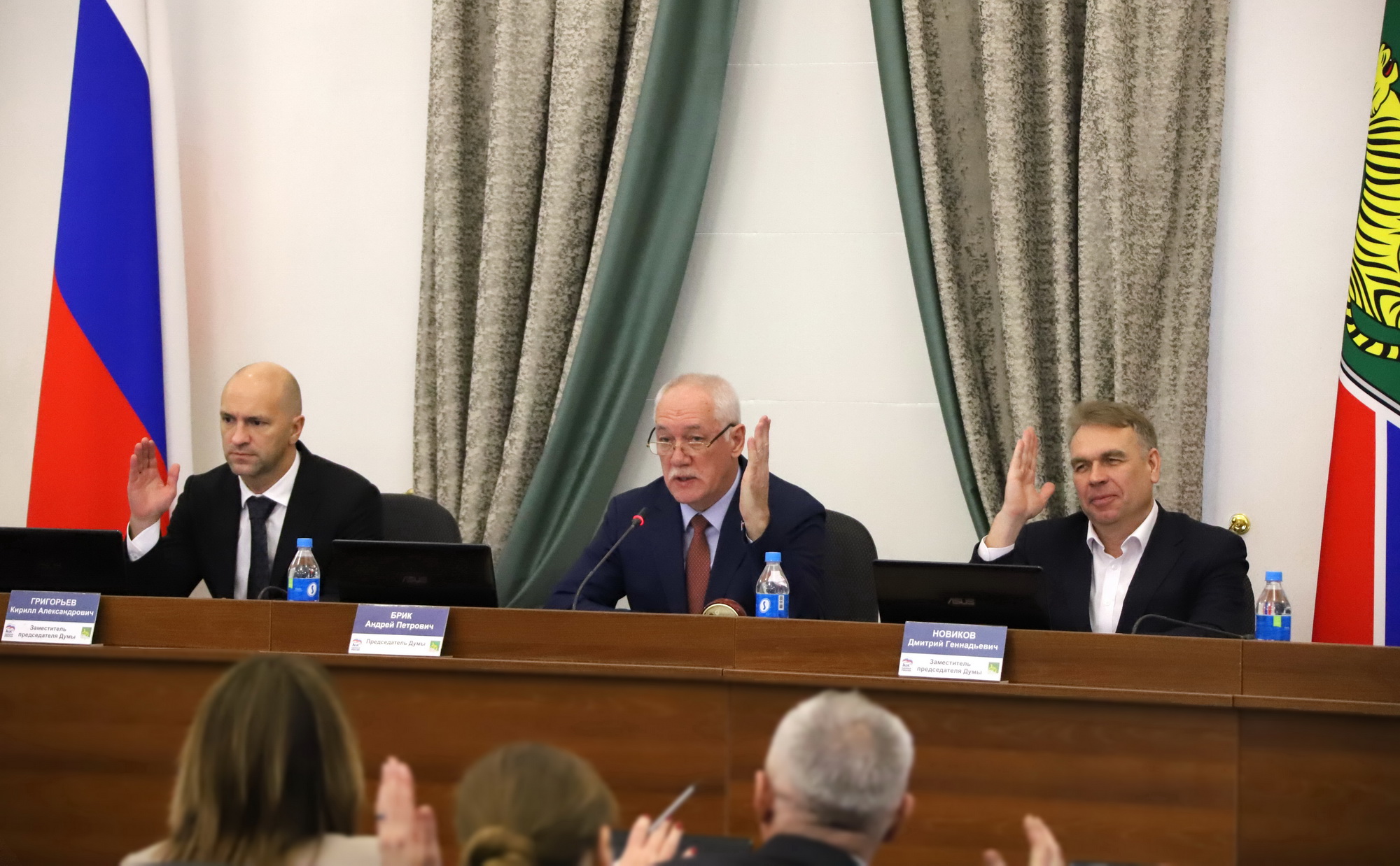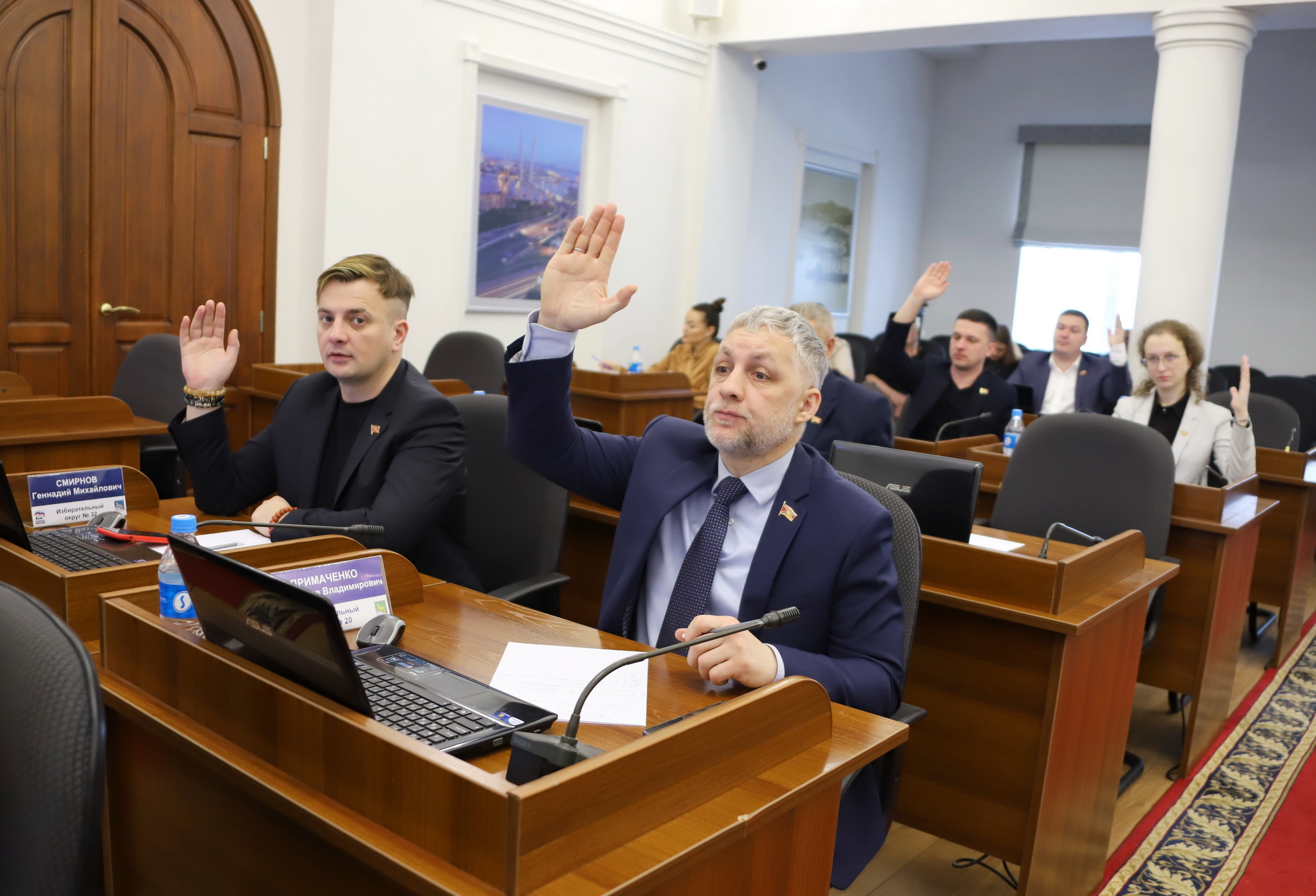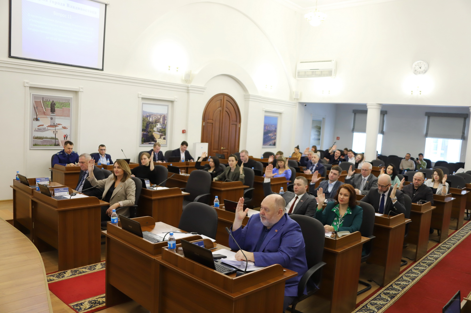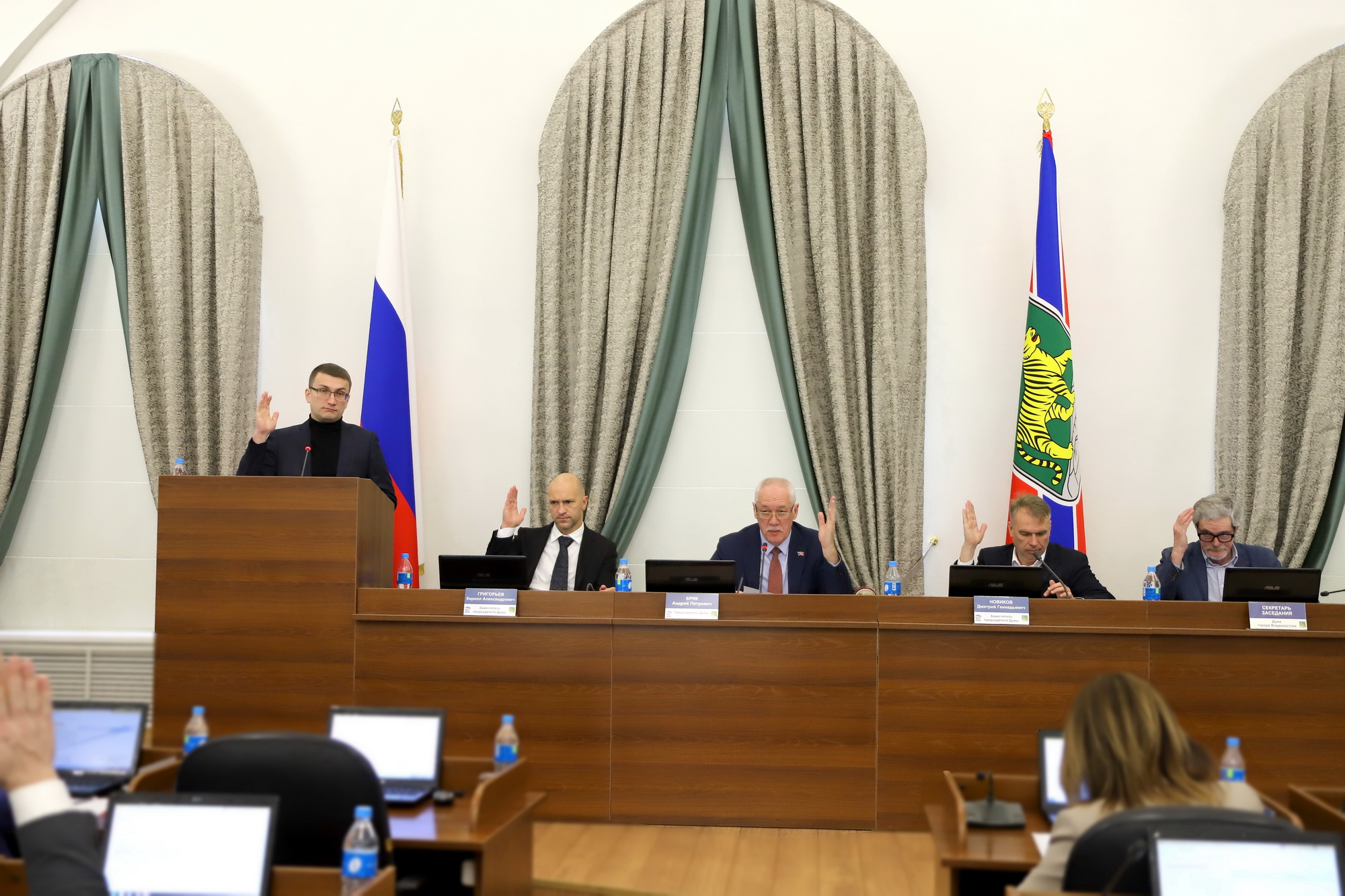 В работе заседания Думы приняли участие председатель Думы города Владивостока Андрей Брик, первый заместитель главы администрации города Сергей Дмитриенко, заместители главы администрации Константин Стоценко, Алексей Сухов, Максим Акульшин, прокурор города Иван Иванов, председатель Контрольно-счетной палаты города Александр Ерзиков, представители профильных управлений администрации города. С содокладами по вопросам повестки дня выступили председатель комитета по местному самоуправлению, законности и развитию институтов гражданского общества Вячеслав Глушко, председатель комитета по экономической политике и муниципальной собственности Василий Васильев, председатель комитета по социальной политике и делам ветеранов Людмила Таран, председатель комитета по молодежной политике, физической культуре и спорту Мария Лагунова, заместитель председателя комитета по бюджету, налогам и финансам Дарья Грицаенко.