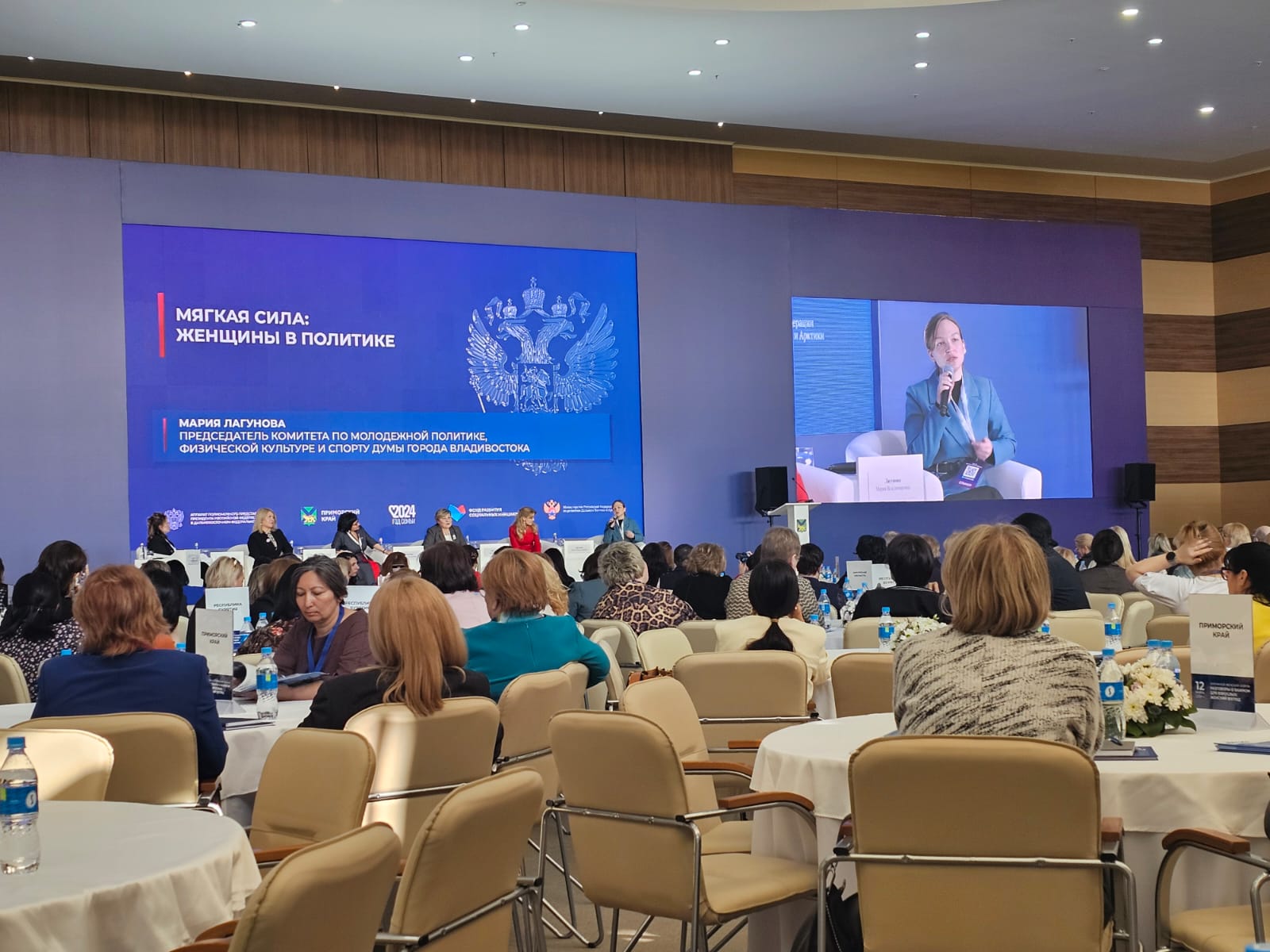 Председатель комитета по молодежной политике, физической культуре и спорту Думы города Владивостока Мария Лагунова рассказала в своем докладе о роли женщины в молодежной политике и мерах поддержки молодежи в Российской Федерации.