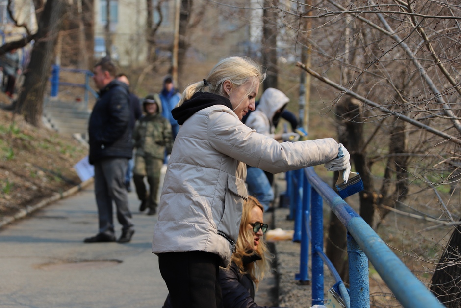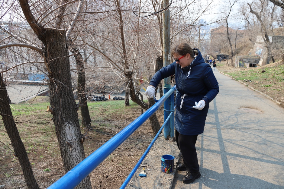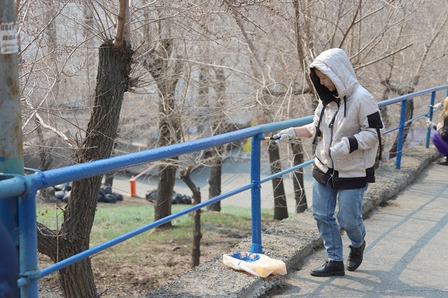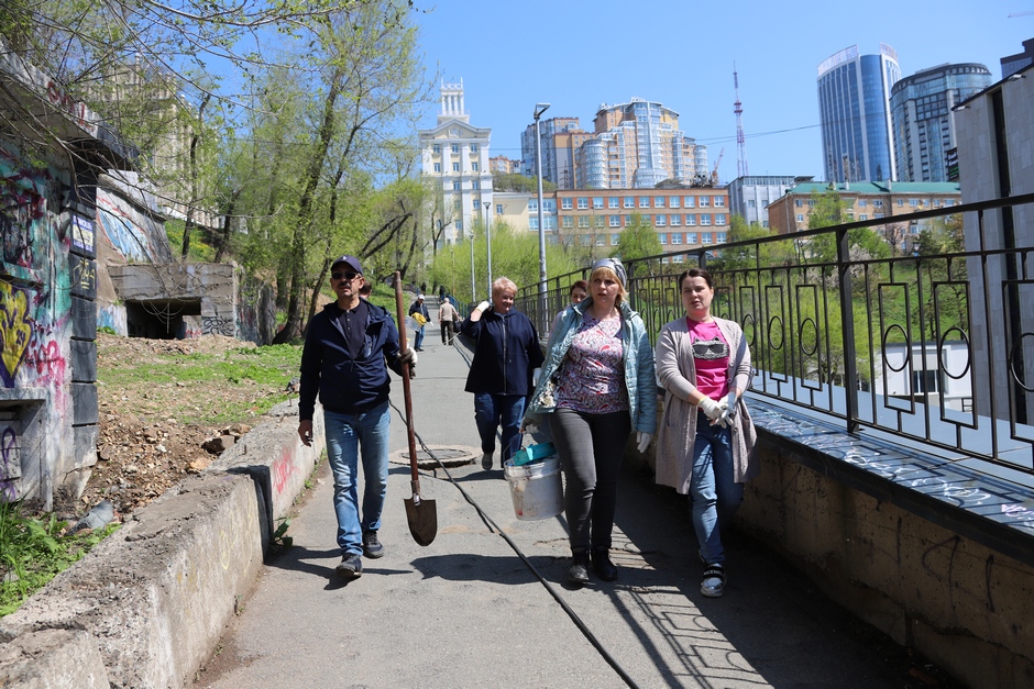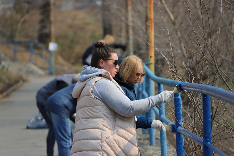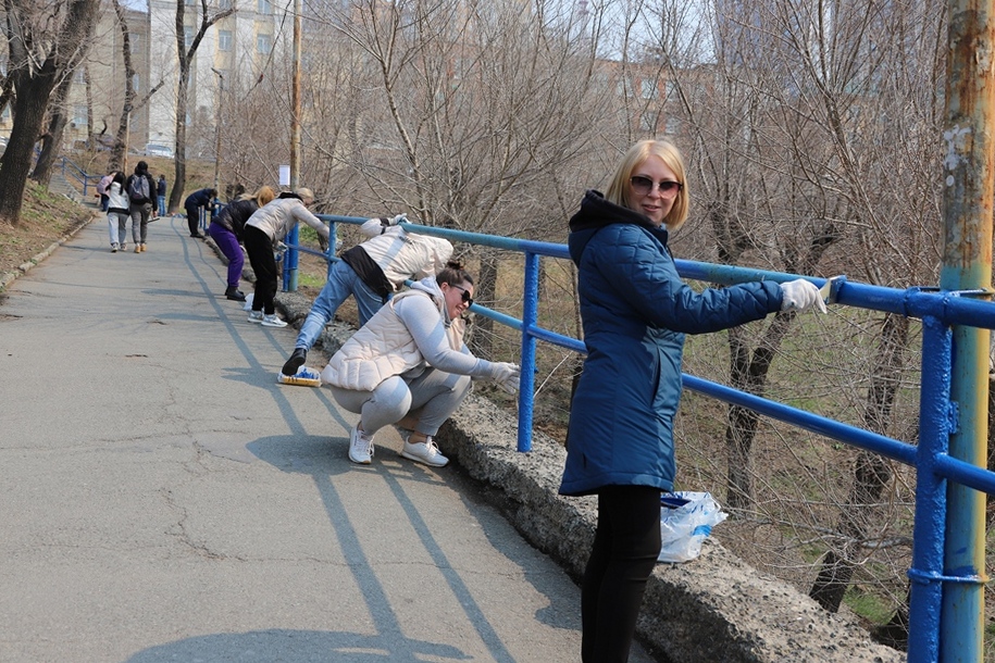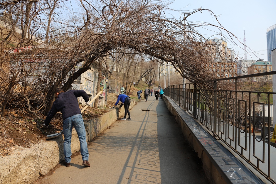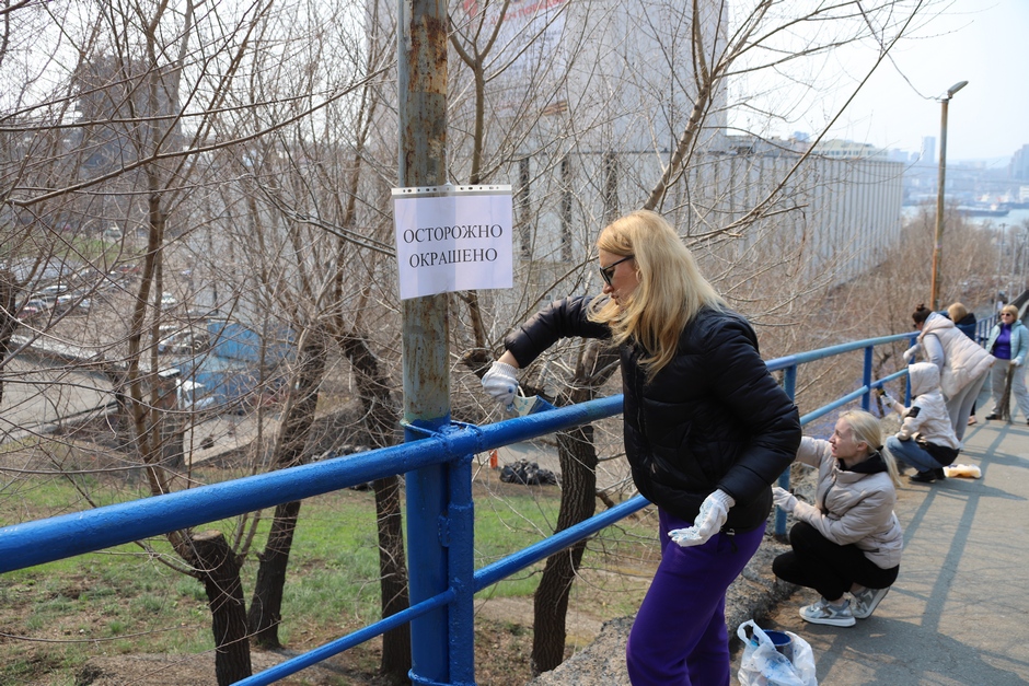 В ходе субботника депутаты и сотрудники аппарата убрали от мусора подземный пешеходный переход через улицу Суханова, лестницу и пешеходную дорожку, ведущие к Приморскому краевому драматическому театру имени Максима Горького, покрасили леерные ограждения, очистили прилегающий склон.