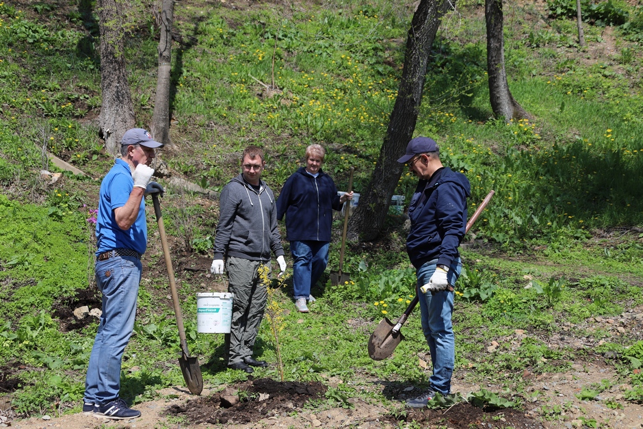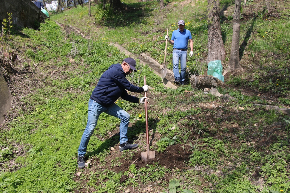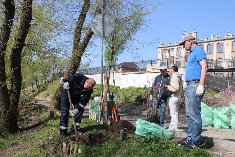 Сотрудники аппарата Думы города Владивостока на субботнике 8 мая продолжили благоустройство склона вдоль пешеходной дорожки, ведущей от пешеходного перехода на улице Суханова к краевому театру имени М.Горького: высадили 10 кустов рододендрона и 7 кустов сирени.