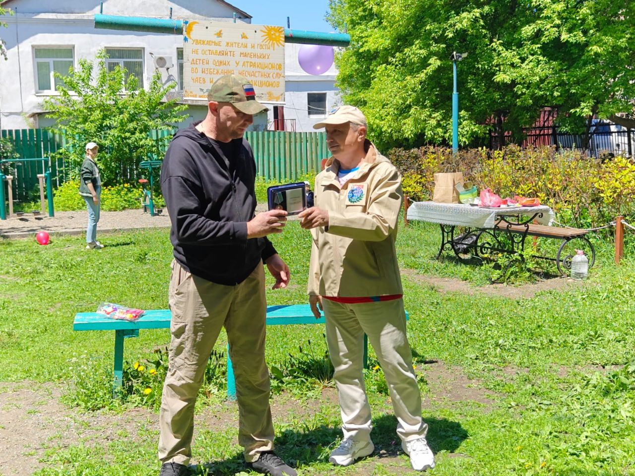 На празднике отметили активных жителей района. Так, представитель регионального отделения общественной организации «Боевое братство» Виктор Донец вручил награду жителю Евгению Королеву за эффективную поддержку участников СВО.