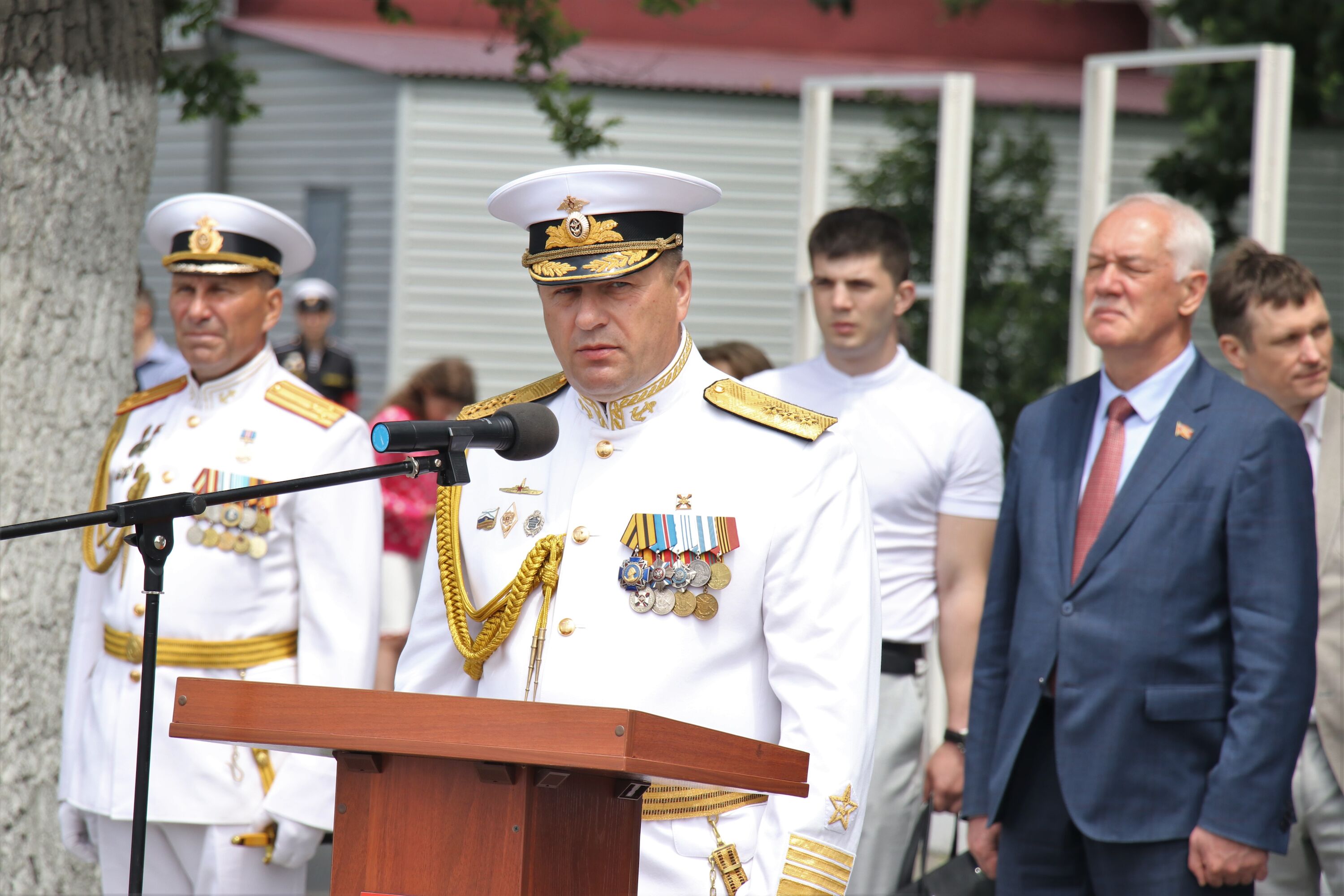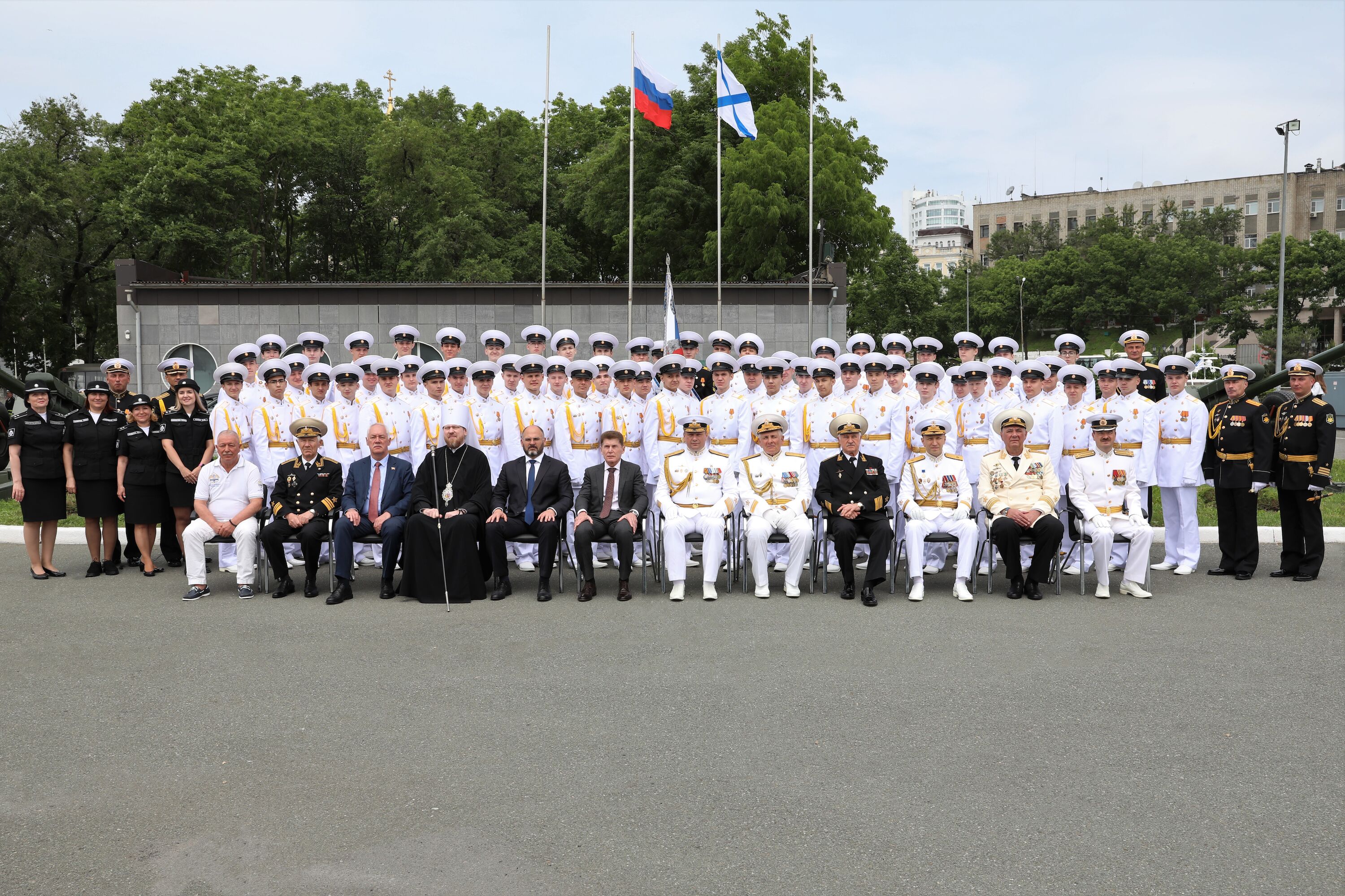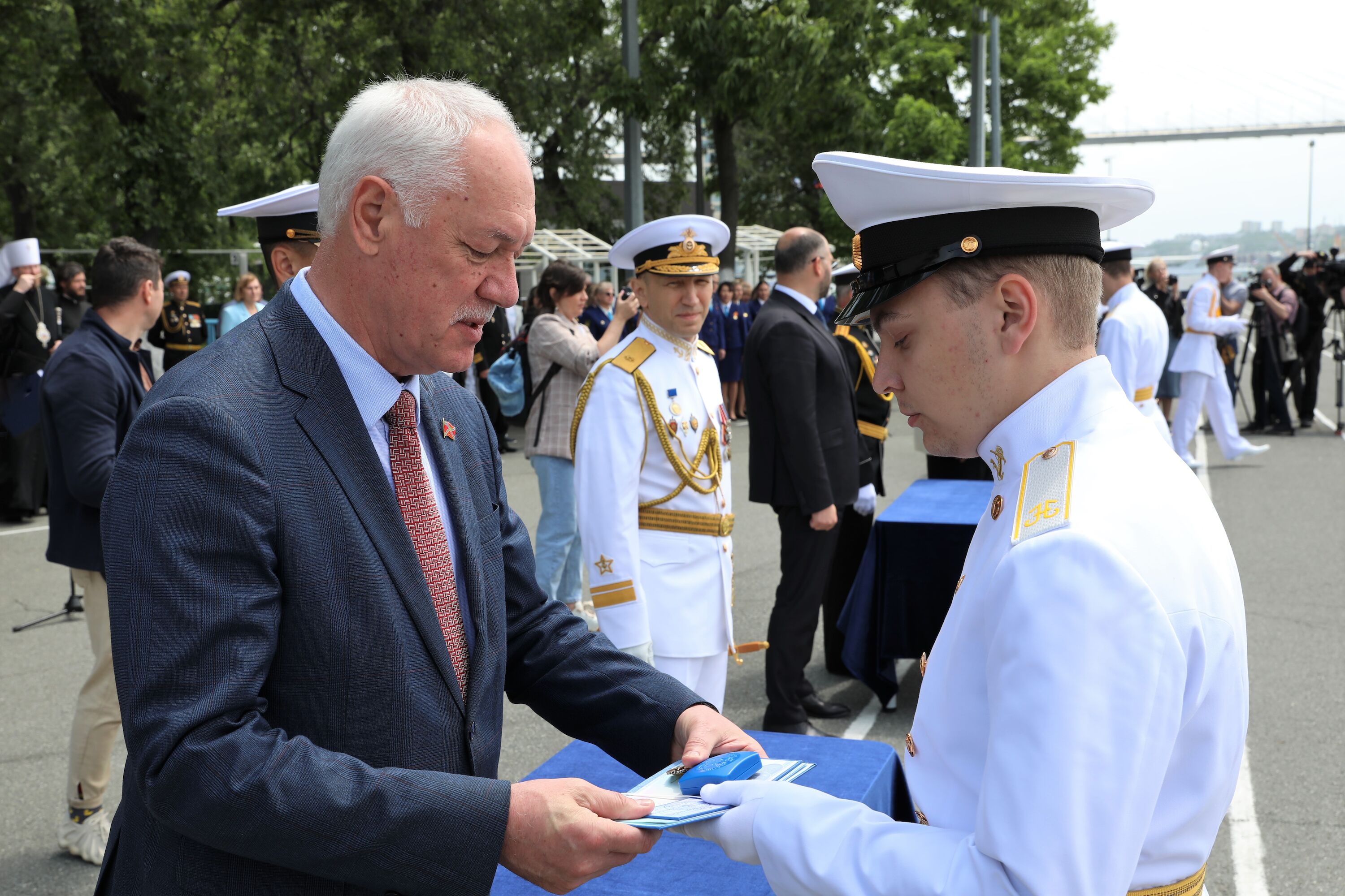 Аттестаты и знаки нахимовца выпускникам филиала НВМУ вручили командующий Краснознаменным Тихоокеанским флотом, адмирал Виктор Лиина, губернатор Приморского края Олег Кожемяко, начальник управления ФСБ России по ТОФ, контр-адмирал Сергей Щербаченко, глава города Владивостока Владимир Шестаков, председатель Думы города Владивостока Андрей Брик, Почетный председатель Владивостокского Морского Собрания, адмирал Константин Сиденко, председатель Союза моряков-подводников ТОФ, вице-адмирал Александр Конев, старшина Владивостокского Морского Собрания, вице-адмирал Сергей Щербаков.