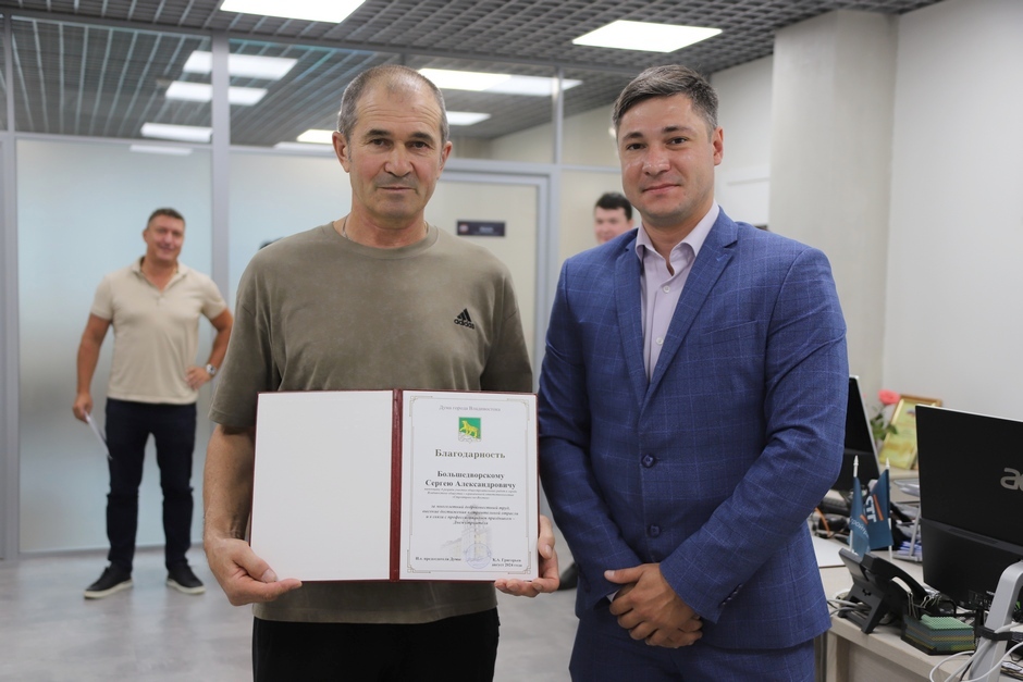 Артём Володин поблагодарил строителей за добросовестный труд, верность профессии, высокие достижения в строительной отрасли и вручил награды Думы города Владивостока.