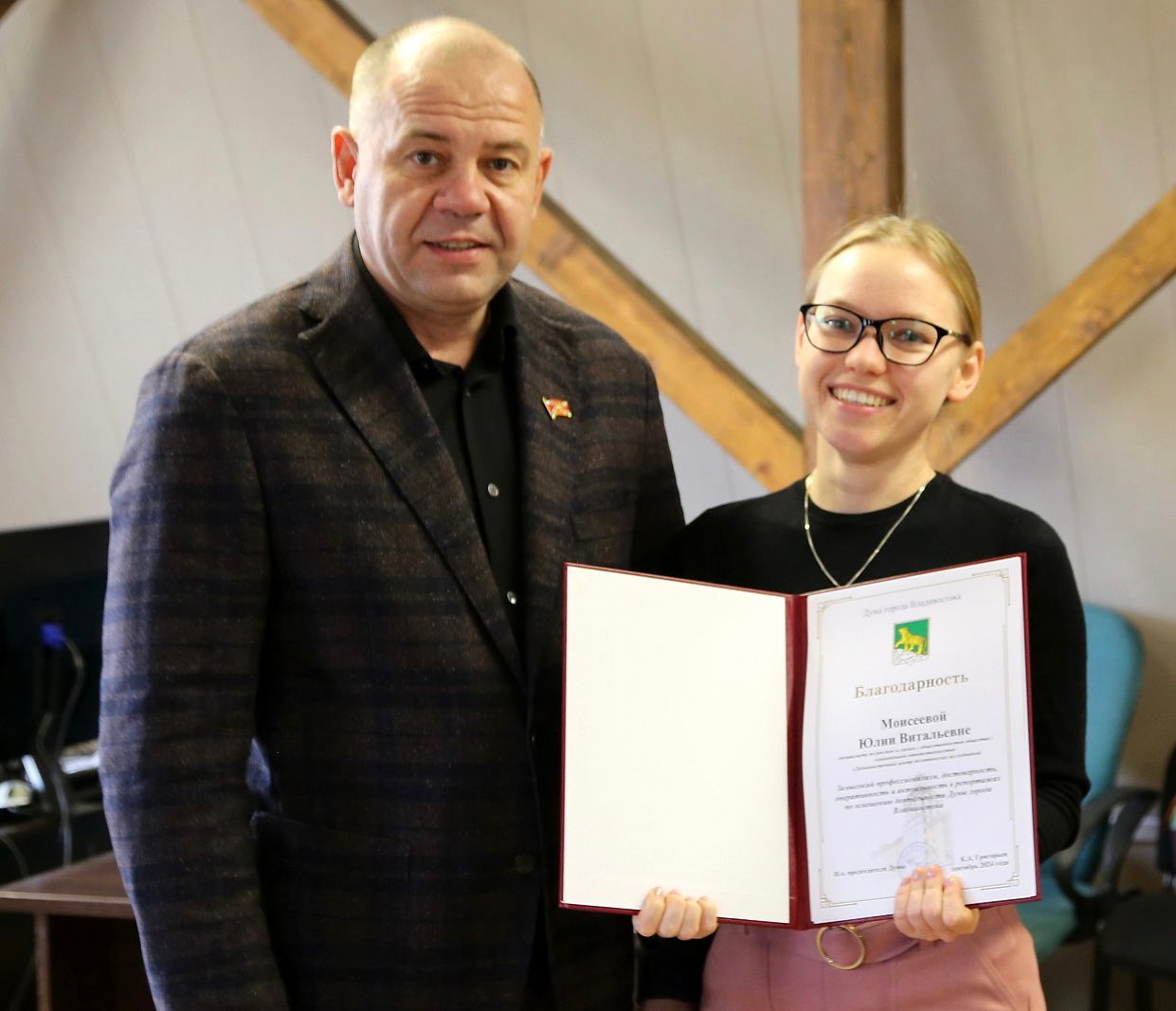 Депутат вручил журналистскому коллективу Почетную грамоту Думы города Владивостока. За высокий профессионализм и плодотворное сотрудничество с депутатским корпусом Благодарностью Думы города Владивостока отмечена специалист по рекламе и связям с общественностью Юлия Моисеева.