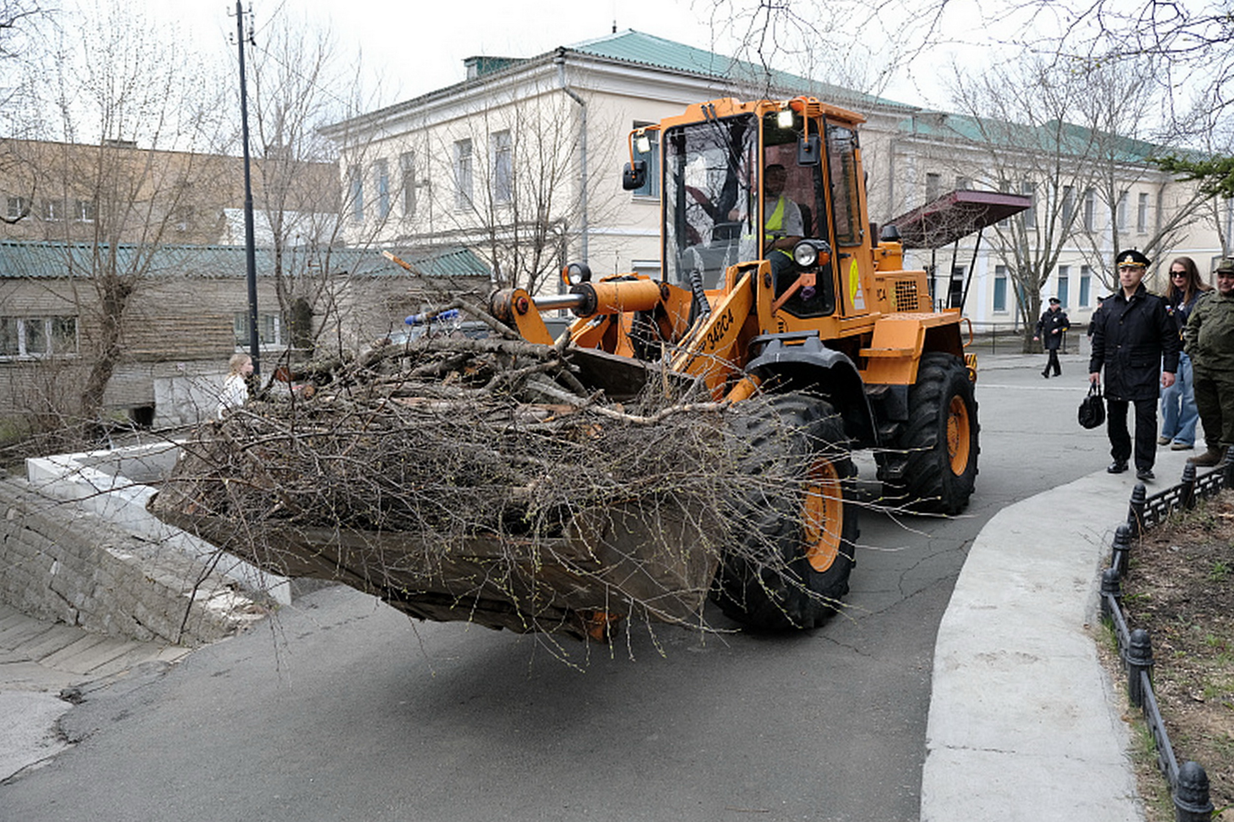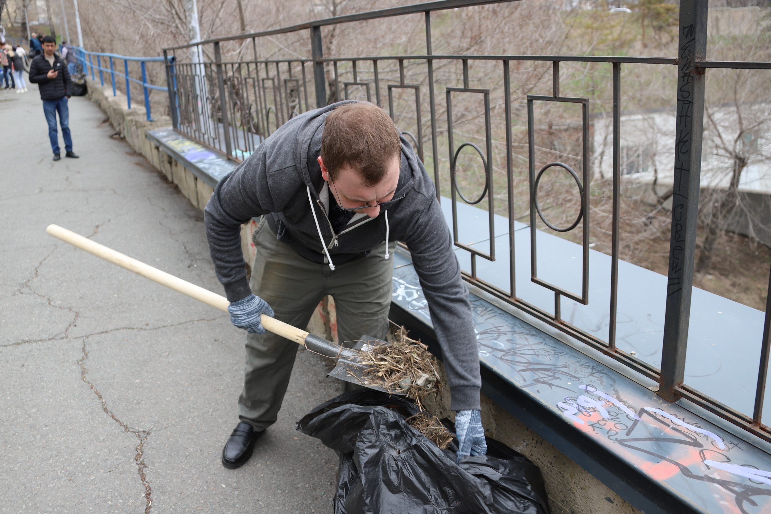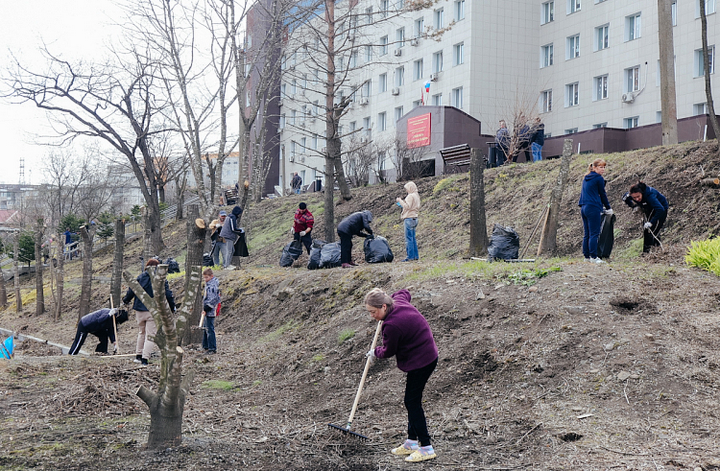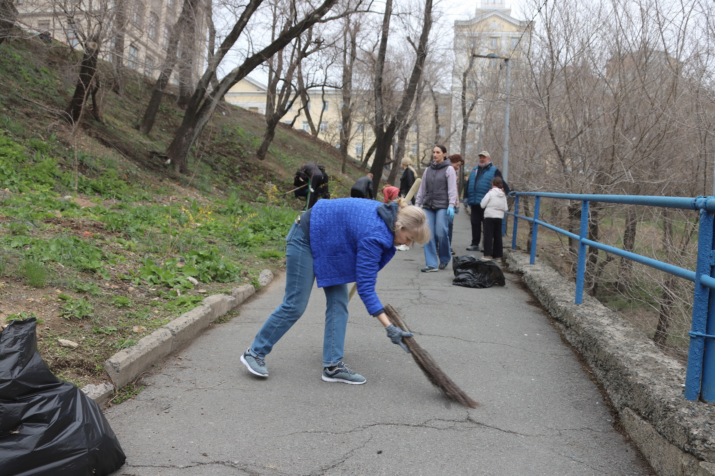 Во Владивостоке в рамках общегородского субботника прошли мероприятия по санитарной очистке общественных, придомовых и ведомственных территорий. Губернатор Приморского края Олег Кожемяко принял участие в уборке территории Госпиталя для ветеранов войн. Главнокомандующий ТОФ Виктор Лиина, глава Владивостока Константин Шестаков помогли с очисткой от мусора территории Госпиталя ТОФ. Председатель Думы города Владивостока Андрей Брик, депутаты Думы Вячеслав Глушко, Артем Володин, сотрудники аппарата Думы, активисты «Единой России» и «Молодой гвардии» привели в порядок подземный переход на ул. Суханова, очистили лестницу и пешеходную дорожку, ведущие к Приморскому академическому краевому драматическому театру им. М. Горького, прилегающий склон.