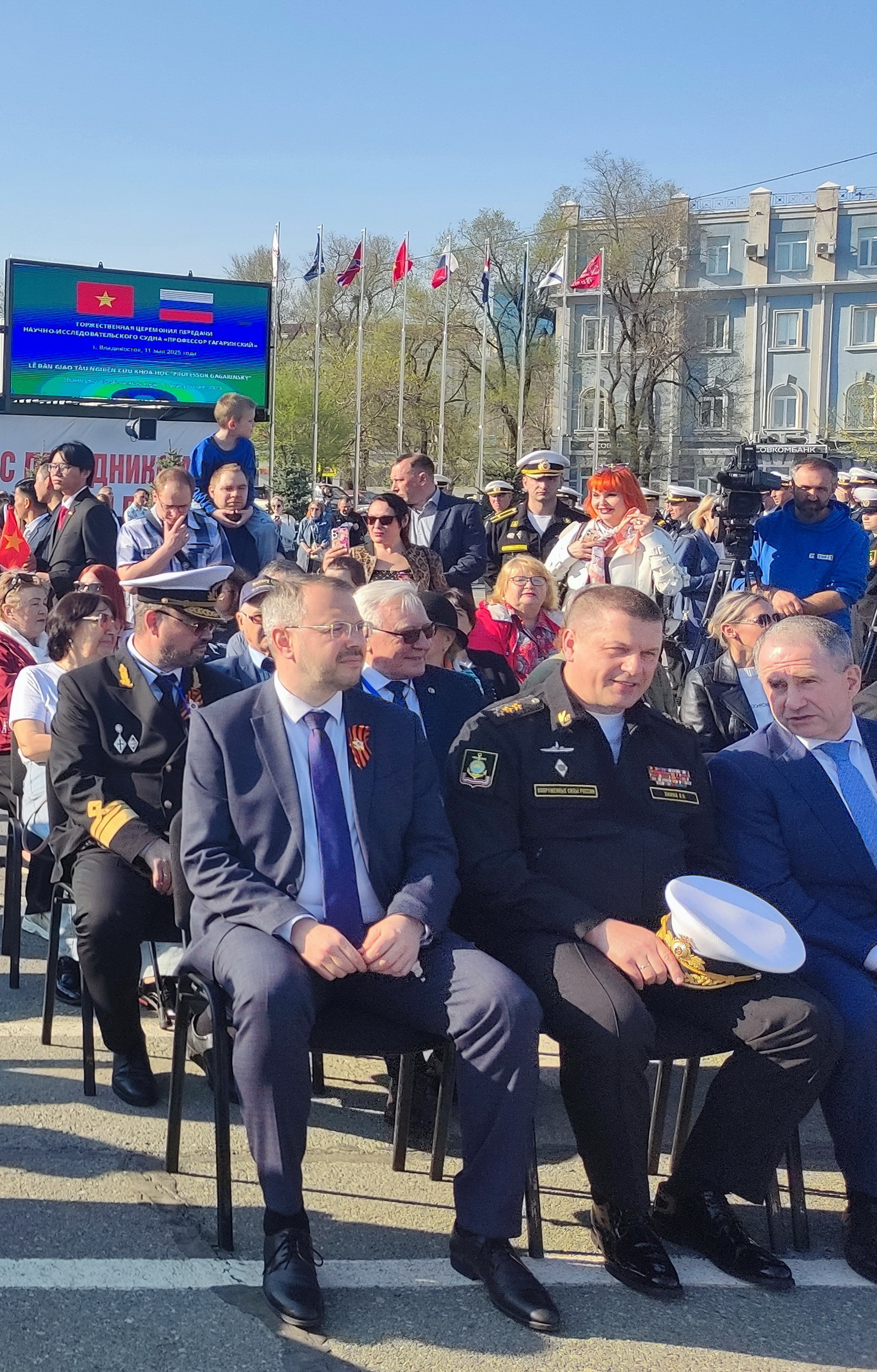 В торжественном мероприятии, прошедшем на 30-м причале Владивостока, приняли участие командующий ТОФ Виктор Лиина, заместитель министра науки и высшего образования РФ Константин Могилевский, заместитель министра обороны Социалистической Республики Вьетнам Хоанг Суан Тиен, ректор ДВФУ Борис Коробец, представители дипломатического корпуса России и Вьетнама, ученые, советник председателя Думы города Владивостока Сергей Крылов, представители общества дружбы с Вьетнамом.