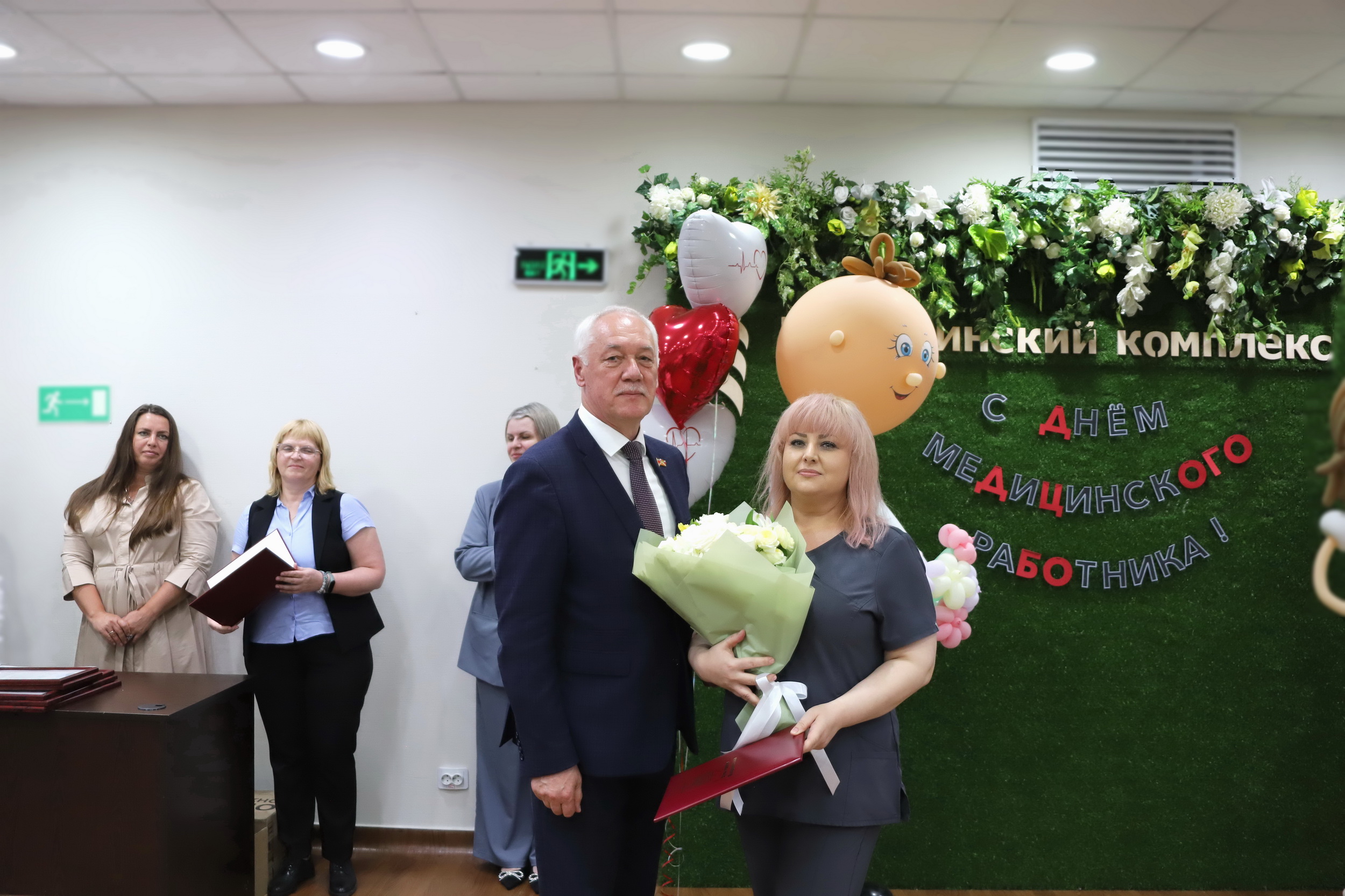 В торжественном мероприятии, приуроченном ко Дню медицинского работника, приняли участие Председатель Думы города Владивостока Андрей Брик, врио главного врача Медицинского комплекса ДВФУ Ольга Логинова, сотрудники лечебно-научного учреждения.