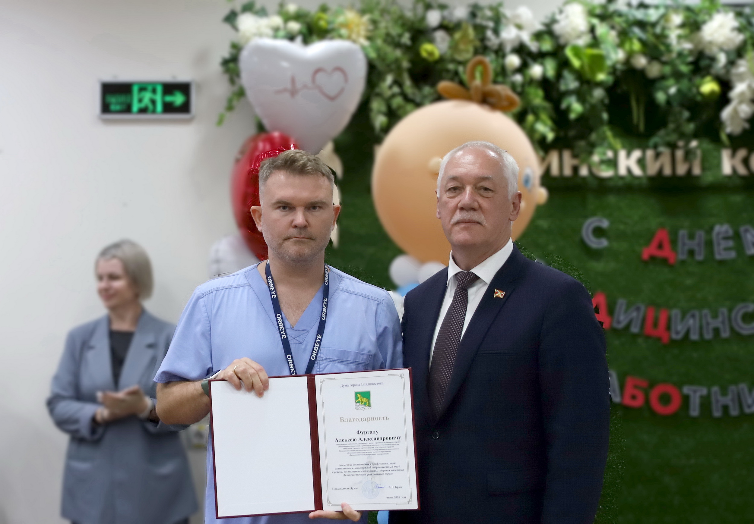 За многолетний добросовестный труд, верность профессии, успехи в деле охраны здоровья населения Андрей Брик вручил Почетные грамоты Думы города Владивостока сотрудникам Медицинского комплекса ДВФУ Анне Кочергиной, Олесе Масловой, Наталье Шатерник. Благодарностей Думы города Владивостока удостоены заведующий отделением, сердечно-сосудистый хирург отделения кардиохирургии и сосудистой хирургии Алексей Фургал, заведующая отделением, врач ультразвуковой диагностики отделения функциональной и ультразвуковой диагностики Юлия Плювак, врач-педиатр Наталья Одинцова.