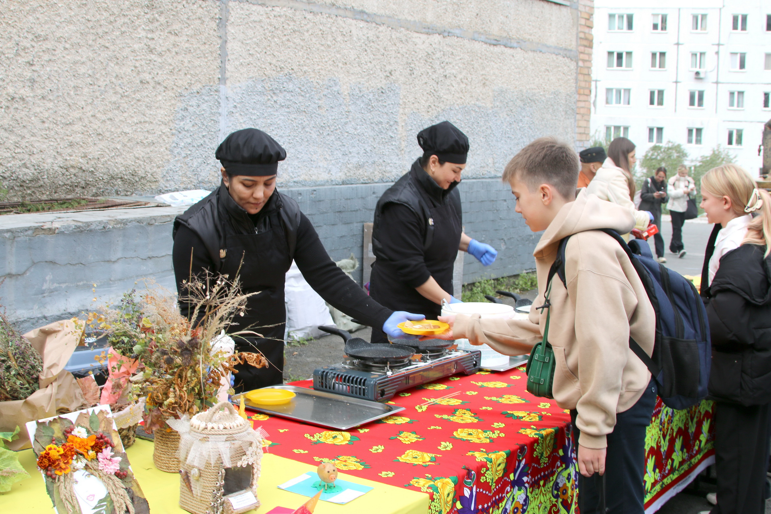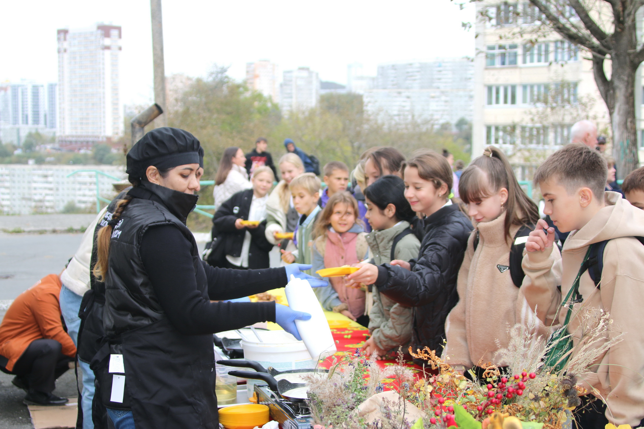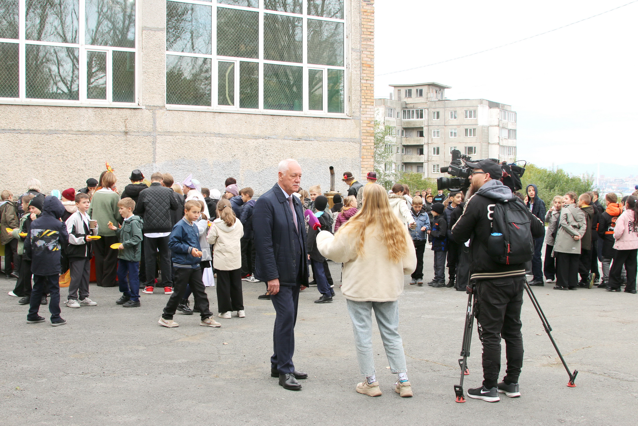 По инициативе представителя Общественного совета Думы города Владивостока, президента ММВК «Достояние» Александра Гетманова на пришкольной территории был установлен настоящий дровяной самовар, организовано чаепитие с блинами и пряниками.