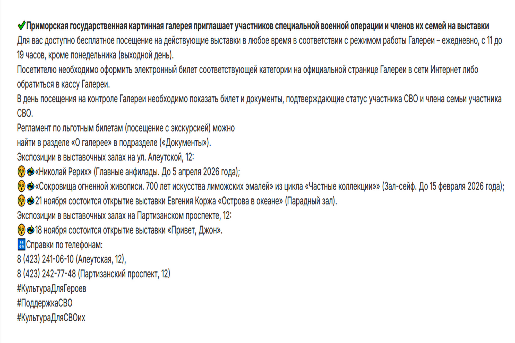 Еще одной культурной площадкой в городе, куда систематически приглашают семьи военнослужащих, стал международный музейно-выставочный комплекс «Достояние». Благодаря инициативам его руководителя Александра Гетманова, при поддержке Думы города Владивостока, местного отделения партии «Единая Россия» дети военнослужащих инженерно-саперного полка ТОФ побывали на выставке, посвященной традициям празднования новогодних и рождественских праздников. Комплекс «Достояние» поддержал проведение конкурса «С поэзией к победе!», организованного АНО «Ветераны боевых действий Приморского края», на котором декламировались стихи участников СВО. Новой инициативой Александра Гетманова стали культурно-просветительские мероприятия на площадке филиала национального центра «Россия» во Владивостоке, которые также смогли посетить военнослужащие.