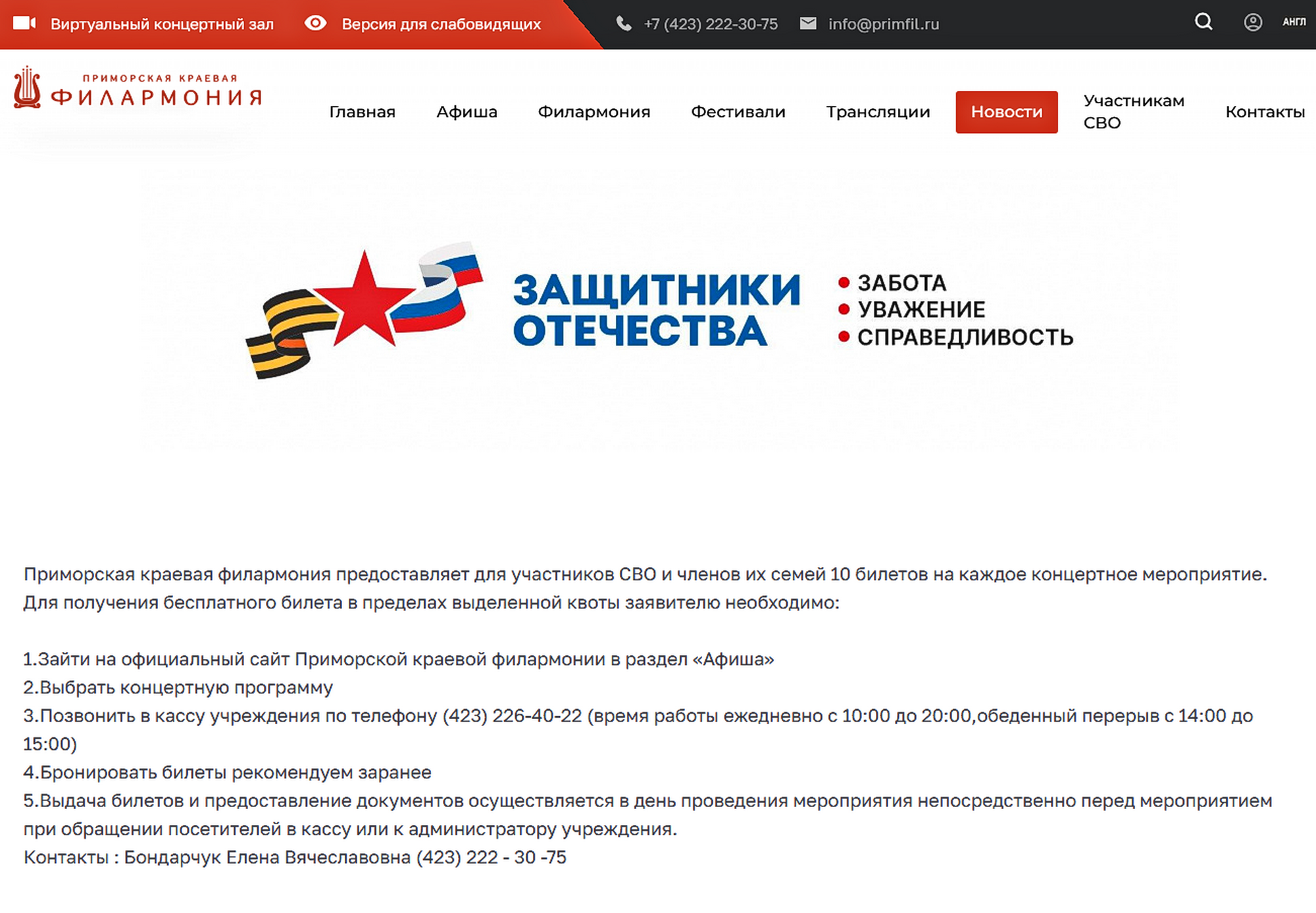«Важно, что в год 80-летия Великой Победы льготные билеты были вручены ветеранам и приравненным к ним категориям граждан, блокадникам, а также семьям военнослужащих, участников СВО, многодетным семьям, членам Всероссийского общества инвалидов, воспитанникам центра социальной реабилитации «Парус надежды». В целом в отчетном 2025 году передано порядка 620 бесплатных билетов», ― подвел итоги гуманитарно-просветительских акций председатель Думы города Владивостока, секретарь местного отделения партии «Единая Россия» Владивостокского городского округа Андрей Брик.