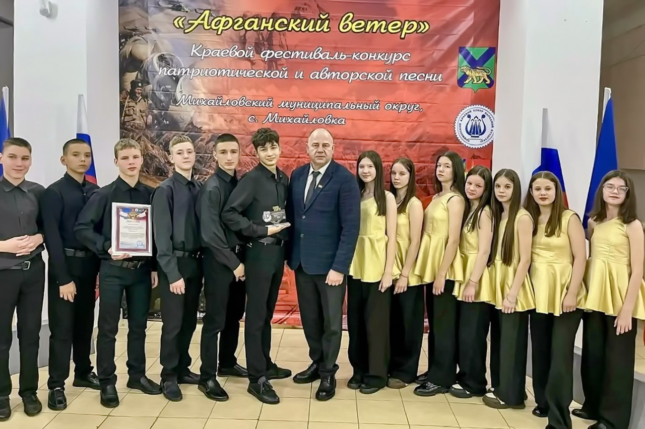 Кроме того, Виктор Тарабарин вручил награды победителям краевого фестиваля-конкурса патриотической и авторской песни «Афганский ветер». Гран-при удостоился творческий коллектив из города Спасск-Дальний ― вокальная группа «Секрет» Центра содействия семейному устройству. А сам фестиваль проводился в селе Михайловка. Масштабное творческое событие, организаторами которого выступили Приморское краевое отделение «Боевое Братство» и региональное отделение движения «Отцы России», объединило более 200 участников - от небольших поселков Приморья до столицы ДНР города Донецка, - которые представили жюри проникновенные выступления, посвященные мужеству и героизму защитников Родины.