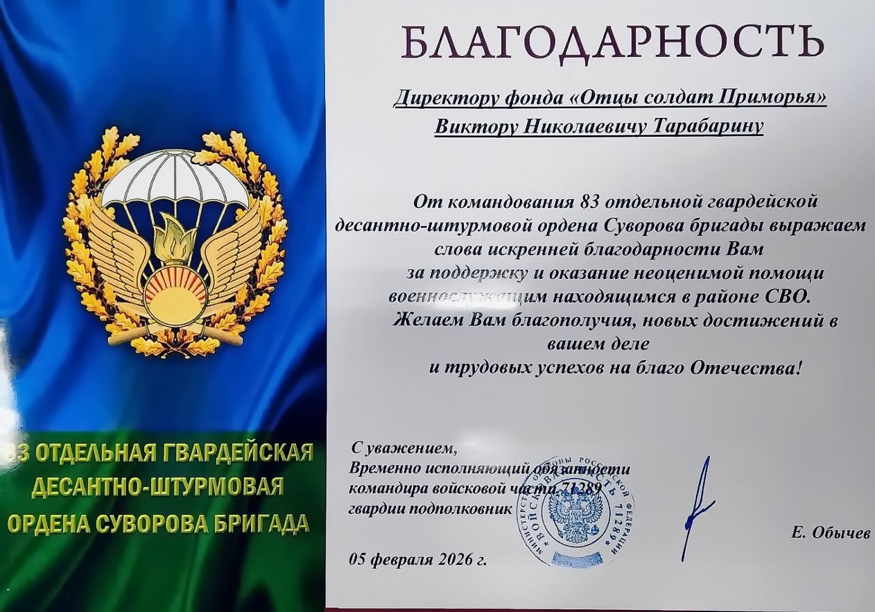 Признанием заслуг по укреплению патриотических традиций Виктора Тарабарина, стоящего у истоков фонда «Отцы солдат Приморья», стало вручение ему Благодарности командования 83-й отдельной гвардейской десантно-штурмовой орденов Суворова и Кутузова бригады ВДВ РФ.