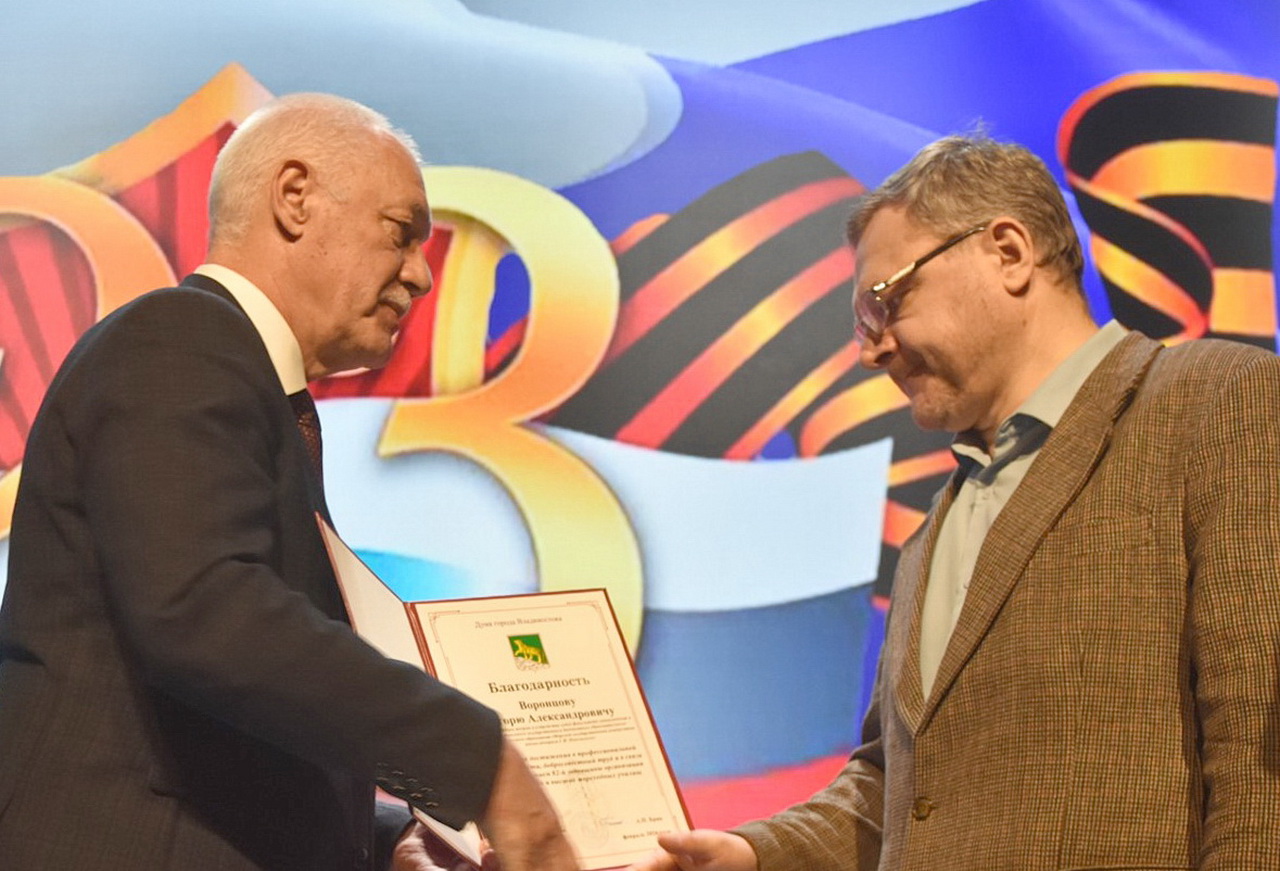 За многолетний добросовестный труд, высокий профессионализм, большой вклад в укрепление традиций патриотического воспитания молодого поколения Андрей Брик вручил награды Думы города Владивостока сотрудникам МГУ им. адм. Г.И. Невельского Игорю Неупокоеву, Игорю Воронцову.