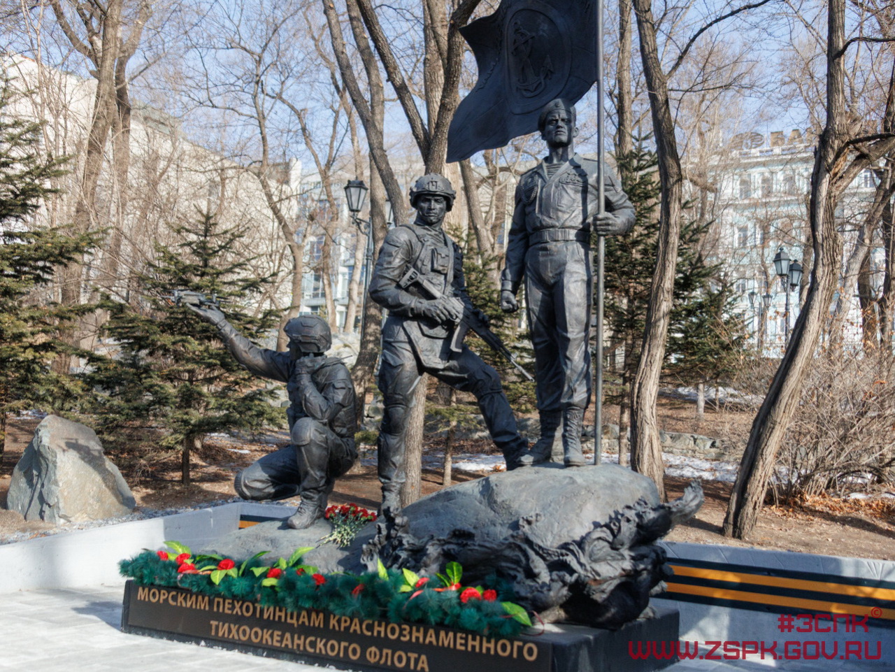 В День защитника Отечества перед мемориалом «Боевая слава ТОФ» торжественным маршем прошла рота почетного караула. Собравшиеся почтили память защитников Отечества, возложили цветы к Вечному огню, а также к памятнику морским пехотинцам Тихоокеанского флота.