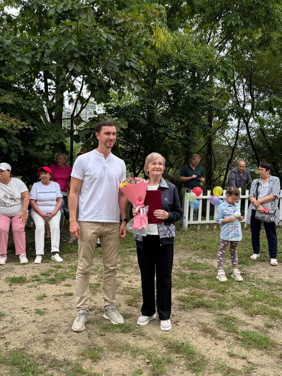 Депутат Думы Александр Бондяев принял участие в празднике открытия новой спортивной площадки ТОС «Баляева, 21», который был организован жителями микрорайона. На площадке установили флаг России, украсили арку шарами и плакатами, в программе праздника было предусмотрено: выступления вокальной группы "Чайка" из хора «Надежда» ДКЖД с участием «Серебряных волонтеров», юной гимнастки Ангелины Колобовой, утренняя зарядка для детей, спортивные конкурсы ГТО, призы, игры и хороводы с белым мишкой-аниматором, песни и танцы. Александр Бондяев вручил Благодарность Думы города Владивостока Валентине Васильевне Коротких, одной из самых активных жильцов дома. Предоставив честь торжественно перерезать ленточку на спортивной площадке самым маленьким участникам праздника, Александр Бондяев отметил, что проживающие в данном доме активные жители каждое лето превращают свою территорию в настоящий цветущий сад.