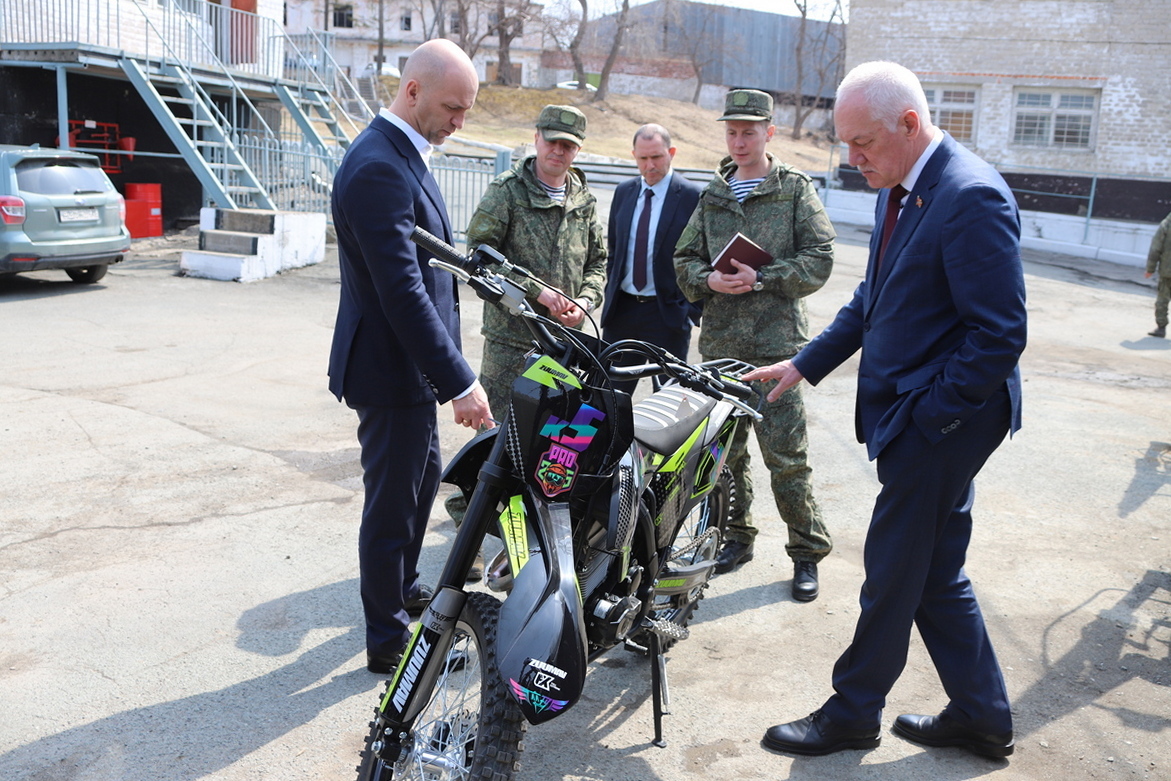 Мотоцикл был доставлен в воинское подразделение и передан руководству части. В мероприятии приняли участие председатель Думы города Владивостока Андрей Брик и заместитель председателя Думы Кирилл Григорьев.
