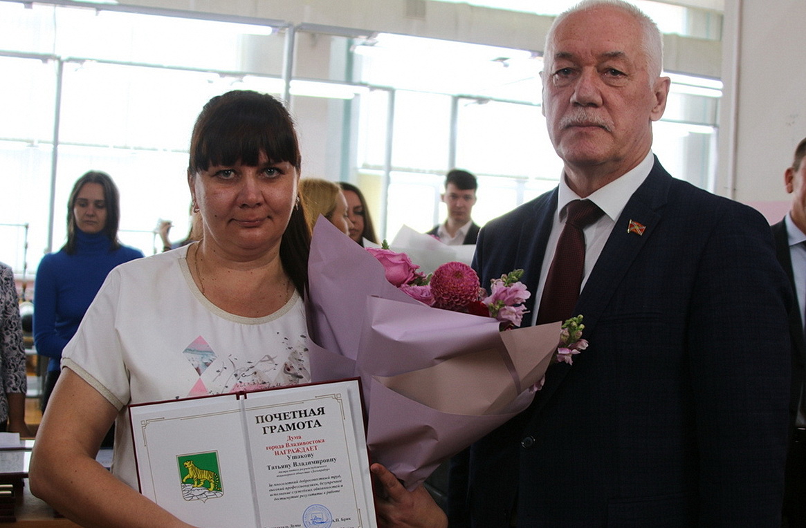 Почетной грамотой Думы города Владивостока награждены ведущий инженер по подготовке производства Светлана Имбировская, инженер конструктор Алексей Смольников, маляр пятого разряда Татьяна Ушакова, монтажник радиоэлектронной аппаратуры и приборов третьего разряда Анжела Черепанова. Благодарностью Думы города Владивостока награждены монтажник радиоэлектронной аппаратуры и приборов четвертого разряда Татьяна Авдеева, электромеханик по лифтам четвертого разряда Павел Александров, ведущий инженер-конструктор Алексей Венедиктов, монтажник радиоэлектронной аппаратуры и приборов третьего разряда Лилия Зарипова, водитель автомобиля Сергей Масленников, заместитель начальника типографии Елена Улькина.