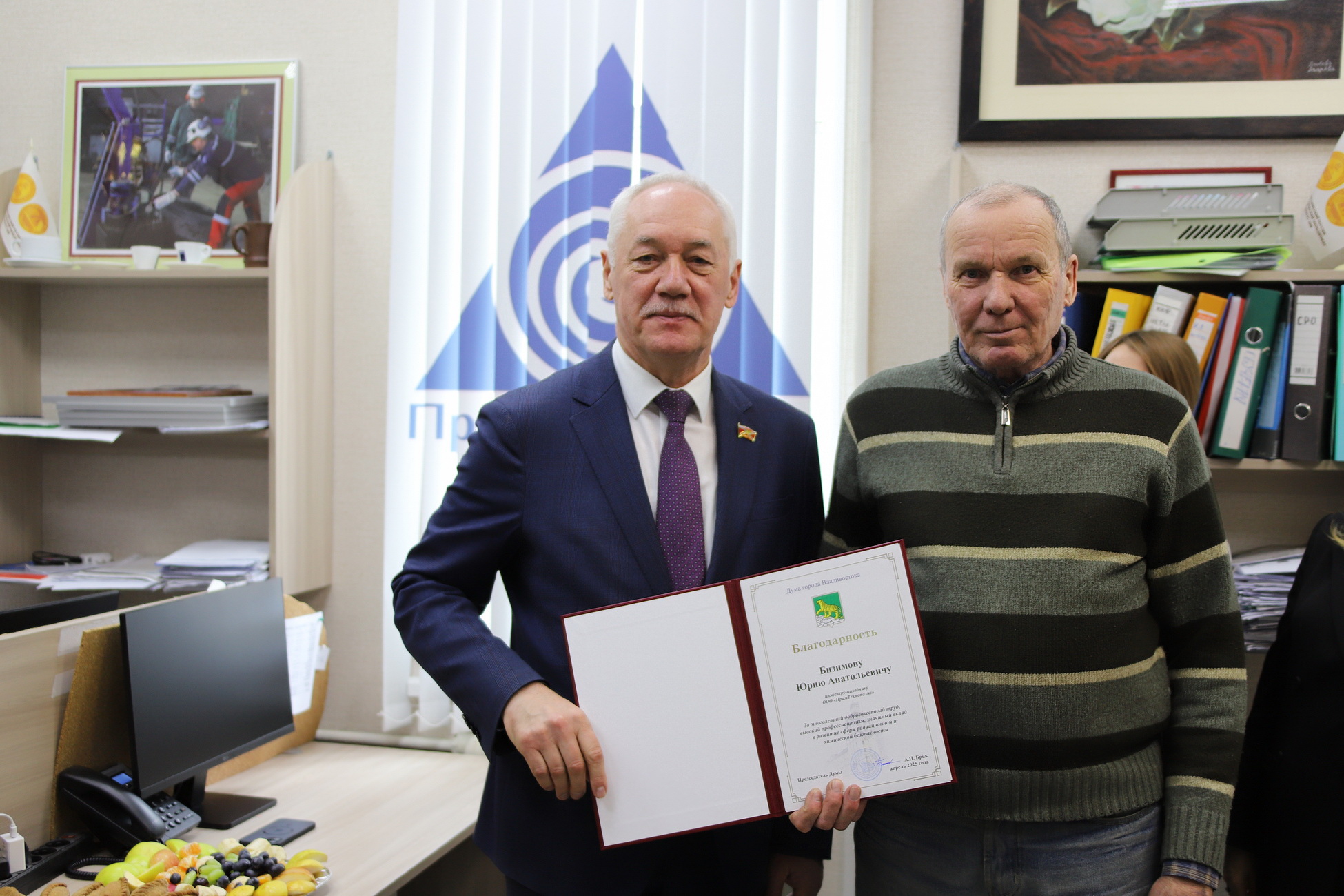 На торжественном мероприятии по случаю 30-летия со дня образования ООО «ПримТехнополис» председатель Думы города Владивостока Андрей Брик вручил работникам предприятия Благодарности Думы.