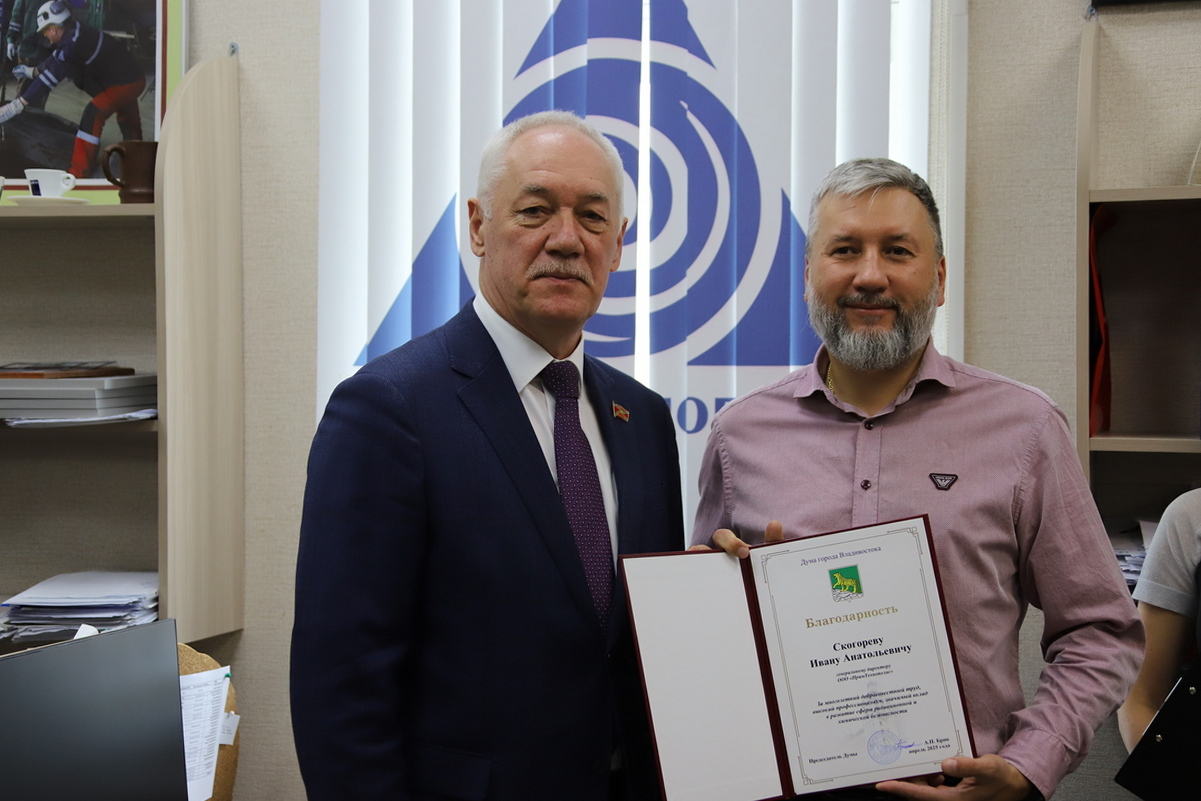 Благодарностью Думы города Владивостока награждены генеральный директор ООО «ПримТехнополис» Иван Скогорев, заместитель генерального директора Виталий Алданов, инженер-эколог Евгений Харчев, руководитель испытательной лаборатории Алексей Пивцаев, инженер-наладчик Юрий Бизимов.