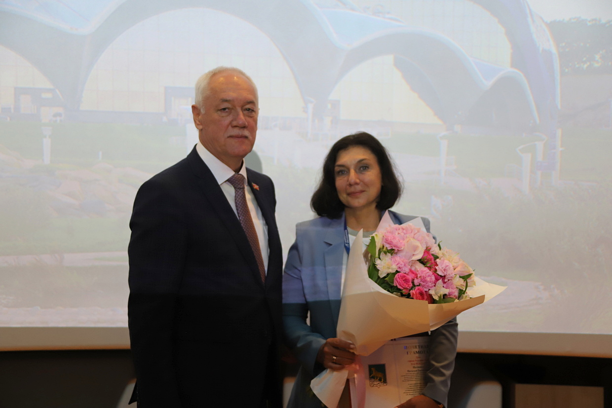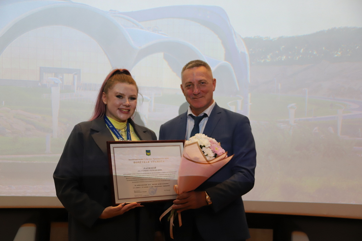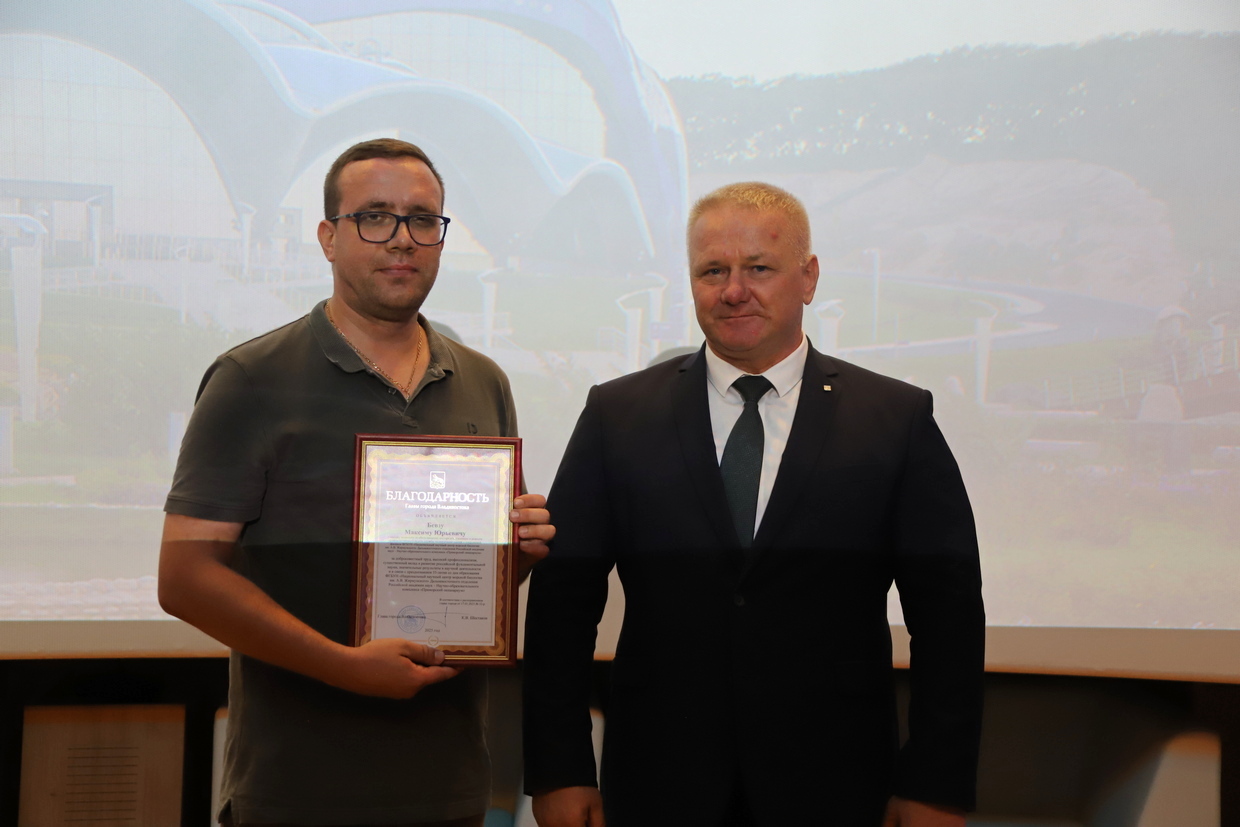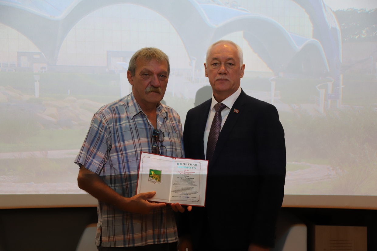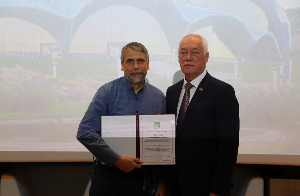 Почетной грамотой Думы города Владивостока награждены начальник отдела обеспечения службы по работе с морскими млекопитающими Валерий Леунов, начальник отдела кадров Наталья Щетинина, Благодарностью Думы города Владивостока - старший тренер сектора тренеров морских млекопитающих Владимир Маслов, руководитель службы формирования экспозиции и учета гидробионтов Андрей Телегин.