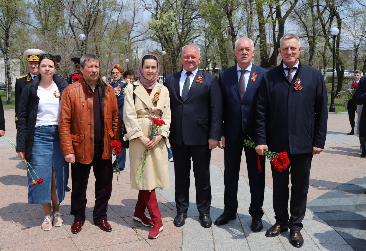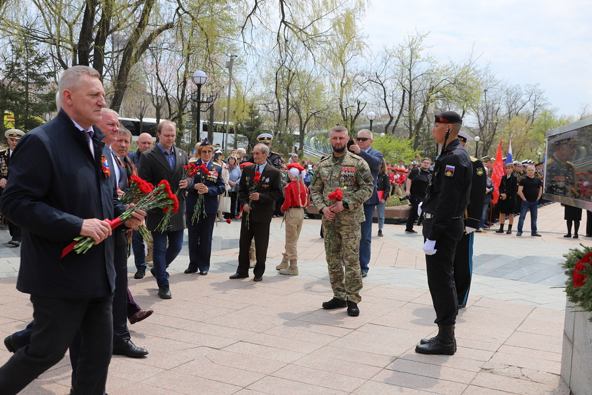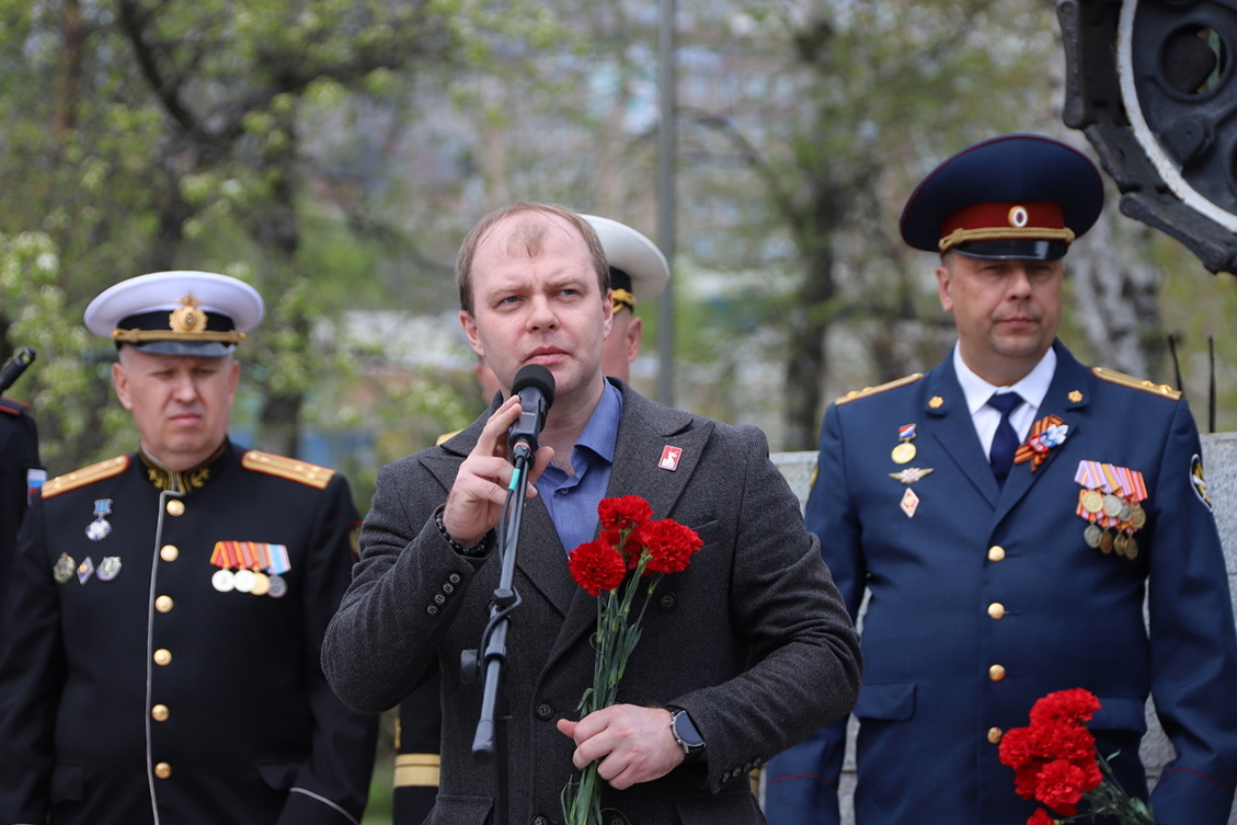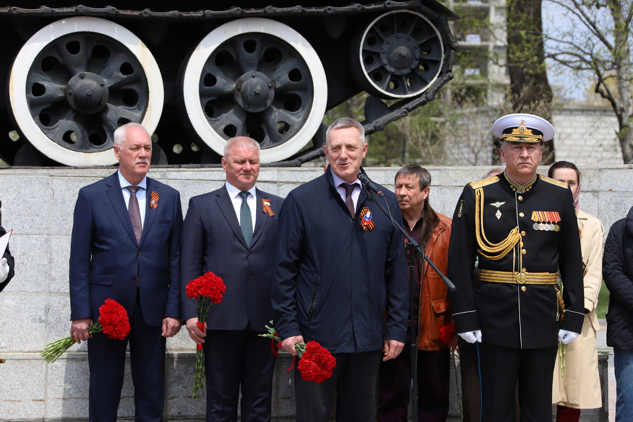Обращаясь к участникам мероприятия, председатель Думы города Владивостока Андрей Брик отметил: «Сегодня мы собрались здесь, чтобы почтить память тех, кто в годы Великой Отечественной войны отстоял независимость нашей страны, освободил народны Европы от нацизма, сыграл решающую роль в разгроме гитлеровской Германии и ее союзников и предопределил исход Второй мировой войны. Достойный вклад в Победу внесли и жители Владивостока. В годы войны из Приморского края и города Владивостока было мобилизовано более двухсот тысяч человек, тысячи приморцев ушли на фронт добровольцами. Воины-тихоокеанцы героически сражались на всех фронтах Великой Отечественной войны. Те, кто остался в тылу, самоотверженно трудились, обеспечивая армию и флот всем необходимым. Поддерживая армию, приморцы собрали пожертвования на строительство танковой колонны «Приморский комсомолец». За счет этих средств были построены 20 боевых машин. Экипажи танков, состоявшие из комсомольцев-добровольцев, в составе разных боевых подразделений сражались с врагом на территории Украины, освобождали Польшу и Чехословакию, дошли до Берлина. Массовый героизм жителей города отмечен присвоением Владивостоку почетного звания Российской Федерации «Город воинской славы».