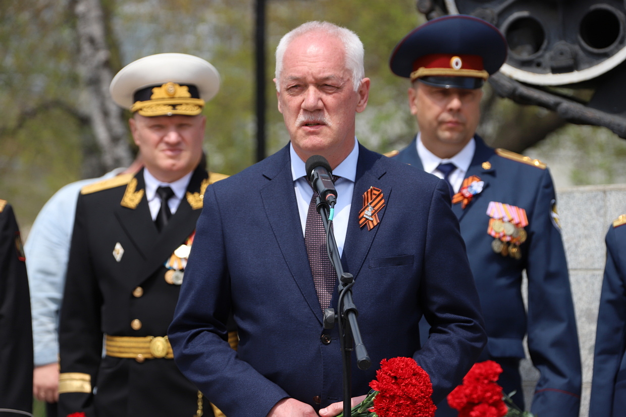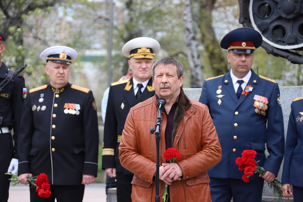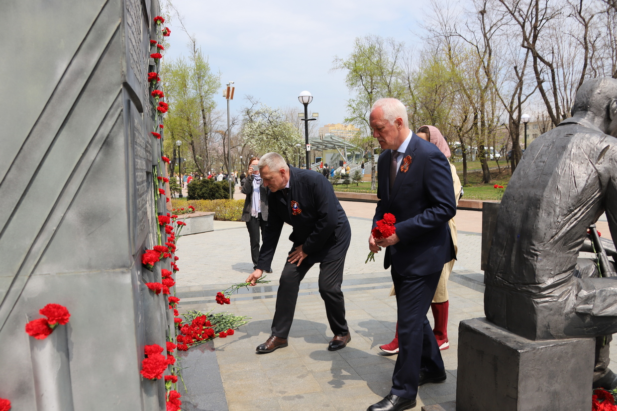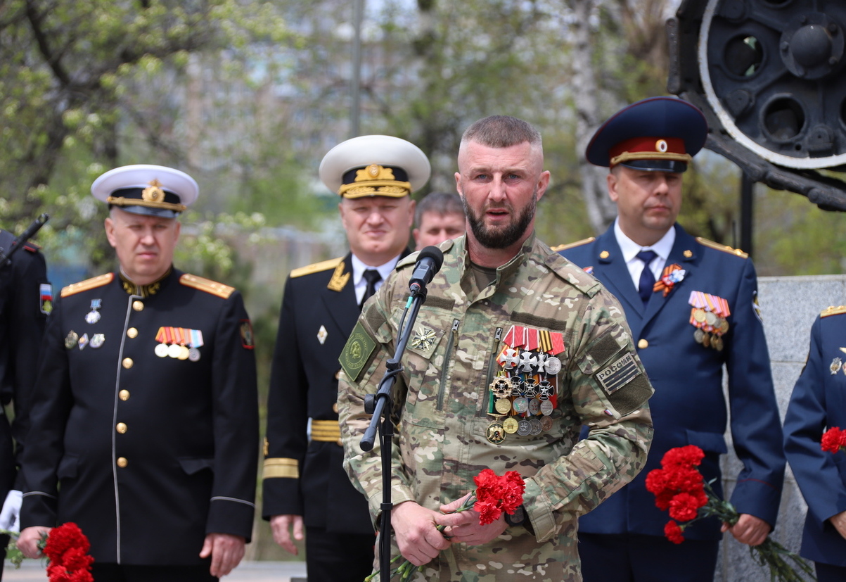 Обращаясь к участникам мероприятия, председатель Думы города Владивостока Андрей Брик отметил: «Сегодня мы собрались здесь, чтобы почтить память тех, кто в годы Великой Отечественной войны отстоял независимость нашей страны, освободил народны Европы от нацизма, сыграл решающую роль в разгроме гитлеровской Германии и ее союзников и предопределил исход Второй мировой войны. Достойный вклад в Победу внесли и жители Владивостока. В годы войны из Приморского края и города Владивостока было мобилизовано более двухсот тысяч человек, тысячи приморцев ушли на фронт добровольцами. Воины-тихоокеанцы героически сражались на всех фронтах Великой Отечественной войны. Те, кто остался в тылу, самоотверженно трудились, обеспечивая армию и флот всем необходимым. Поддерживая армию, приморцы собрали пожертвования на строительство танковой колонны «Приморский комсомолец». За счет этих средств были построены 20 боевых машин. Экипажи танков, состоявшие из комсомольцев-добровольцев, в составе разных боевых подразделений сражались с врагом на территории Украины, освобождали Польшу и Чехословакию, дошли до Берлина. Массовый героизм жителей города отмечен присвоением Владивостоку почетного звания Российской Федерации «Город воинской славы».