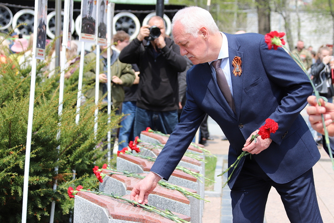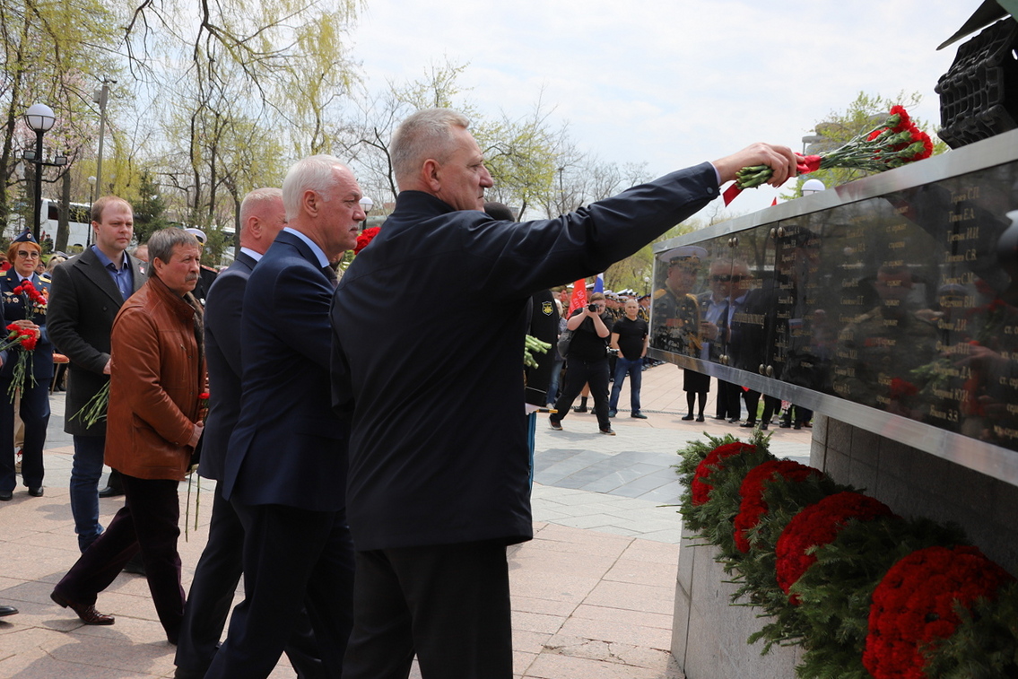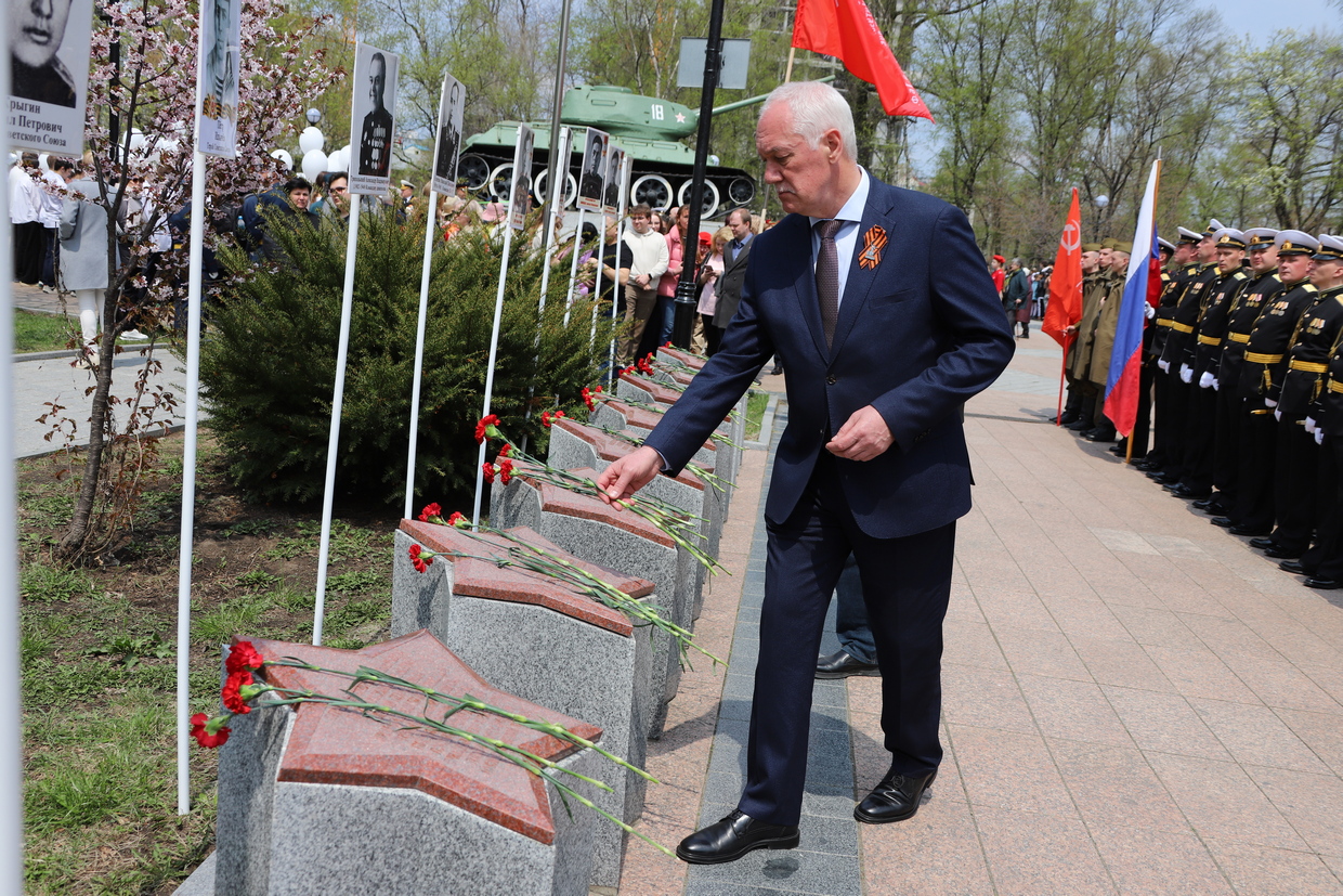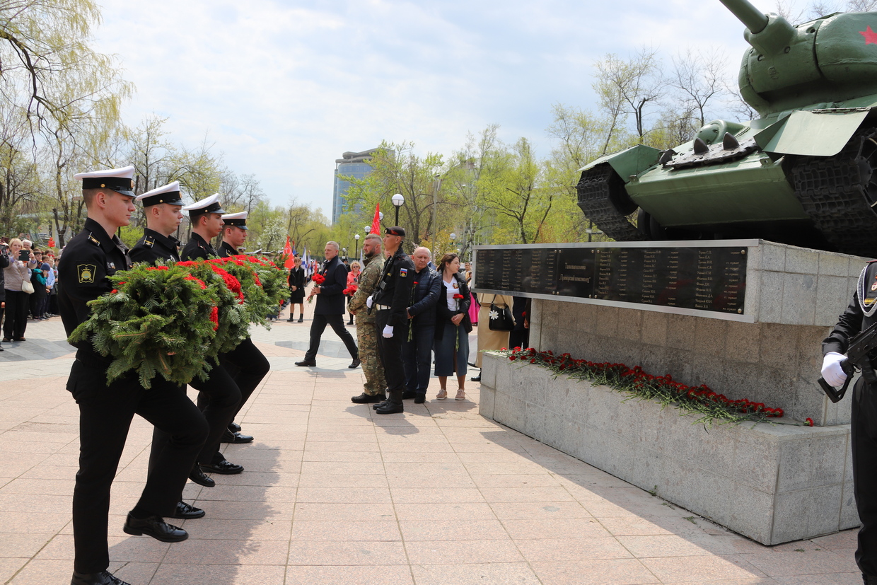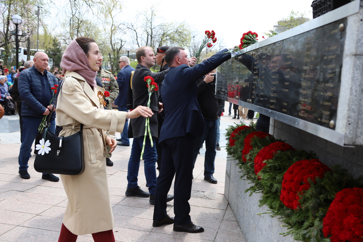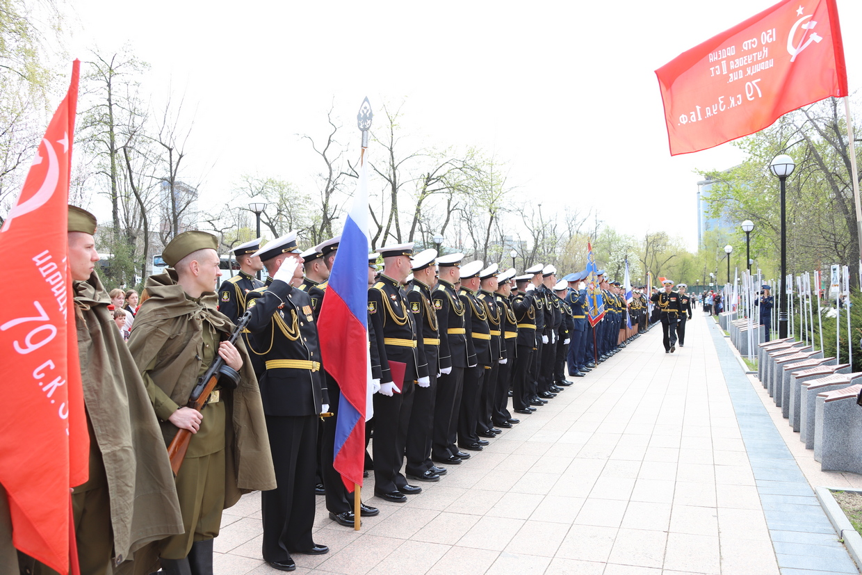На митинге было отмечено, что победа в Великой Отечественной войне была завоевана дорогой ценой. Отдавая дань памяти миллионами советских солдат, оставшихся на полях сражений, участники мероприятия возложили венок и цветы к памятнику танковой колонне «Приморский комсомолец», к Звездам на Аллее Героев, к памятнику приморцам, погибшим в локальных войнах и военных конфликтах. По окончании церемонии возложения собравшиеся почтили память павших минутой молчания. Салютная группа бригады морской пехоты произвела троекратный салют.