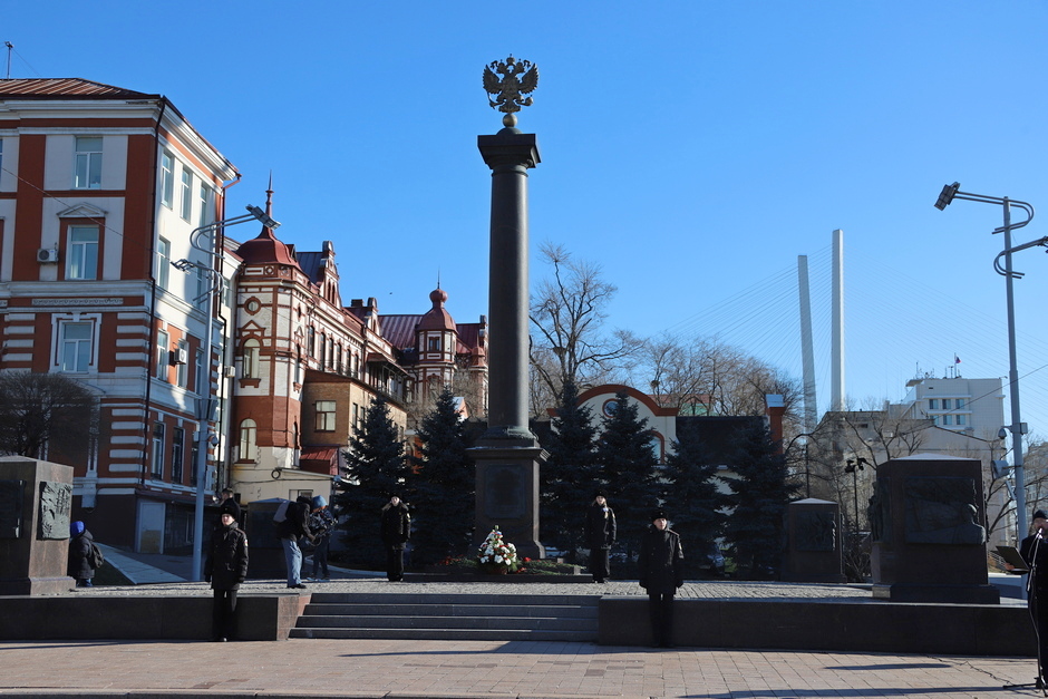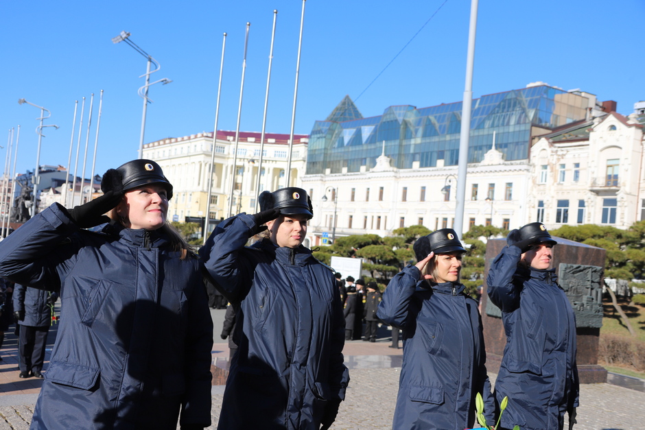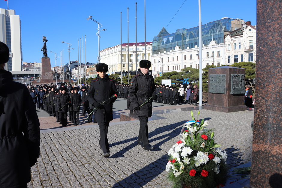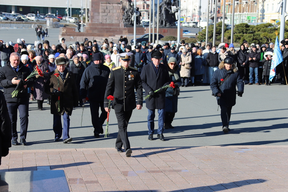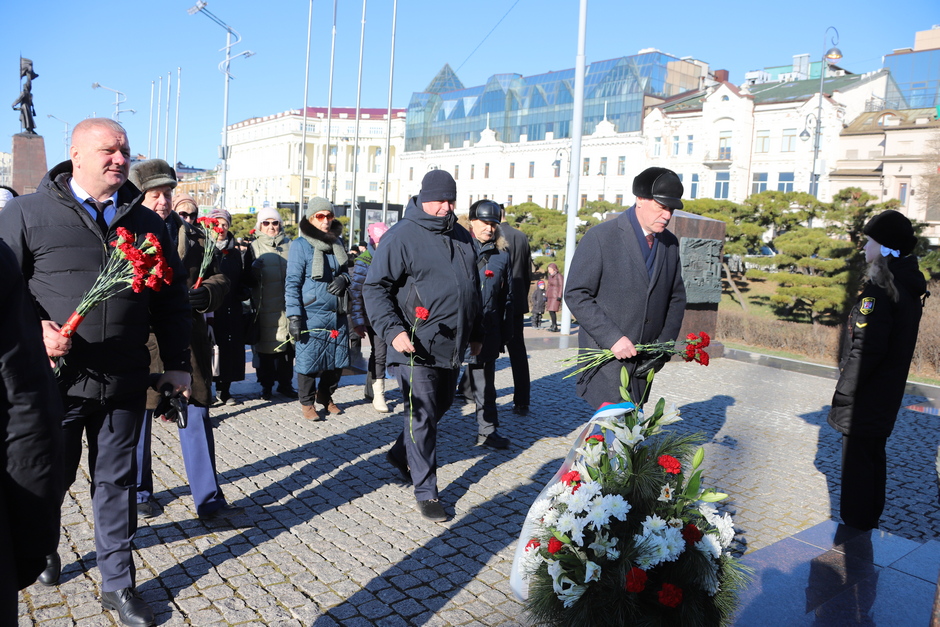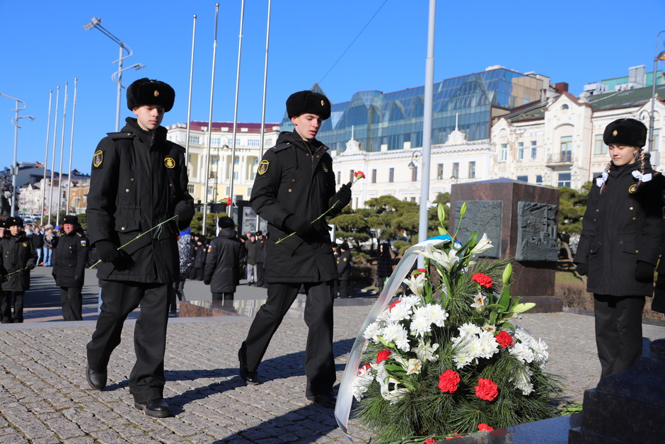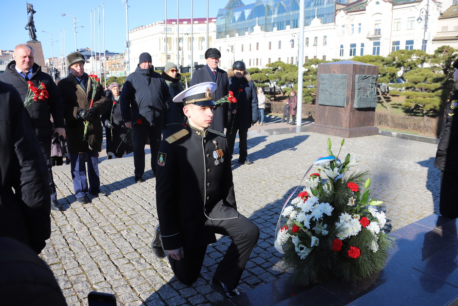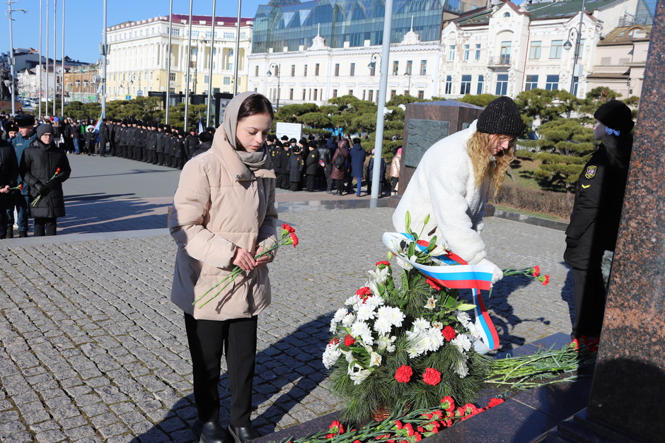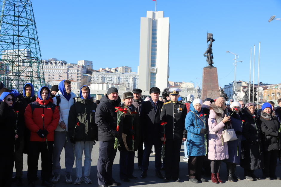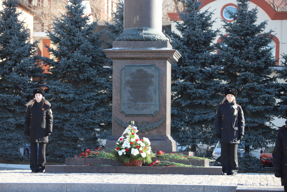 Участники мероприятия минутой молчания почтили память героев, отдавших жизнь за Родину, и возложили цветы к стеле «Владивосток – город воинской славы».