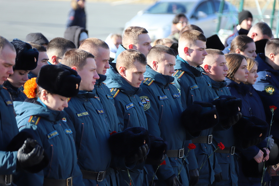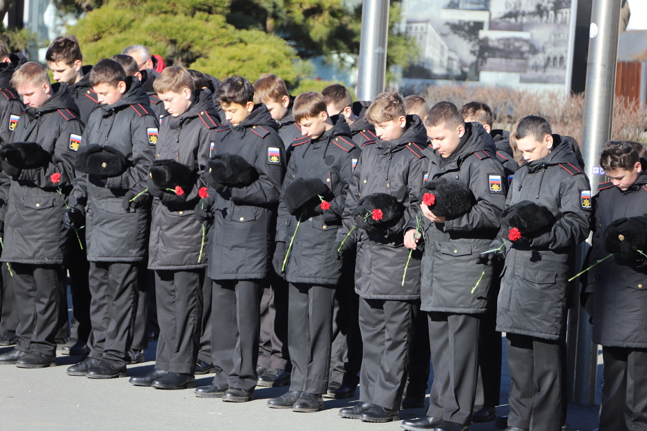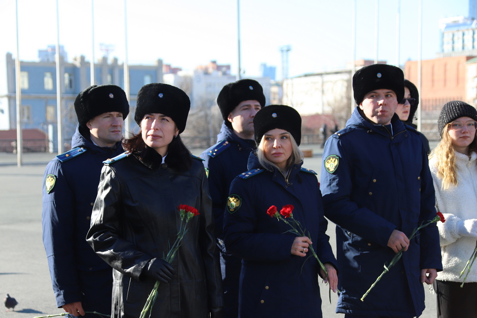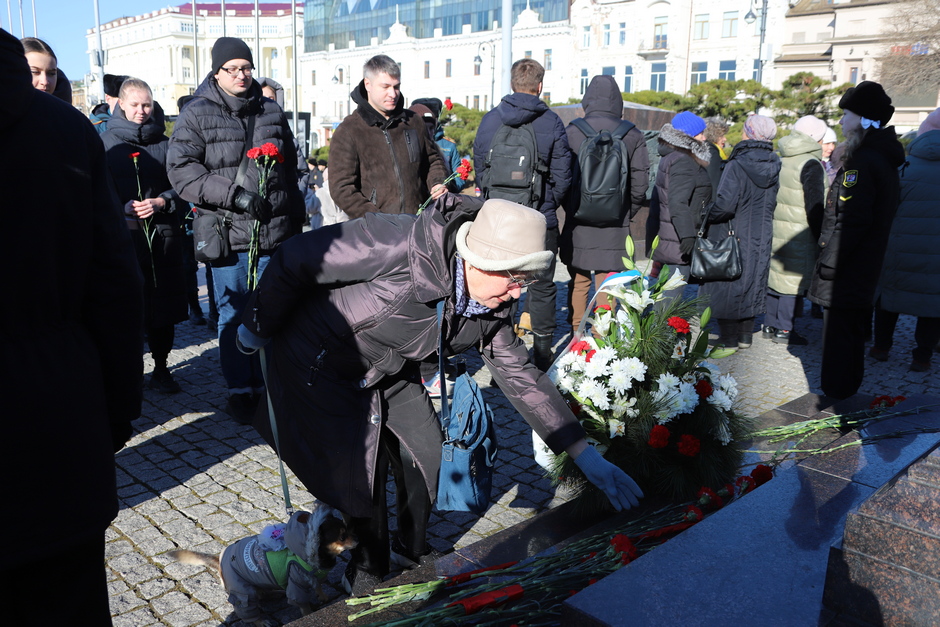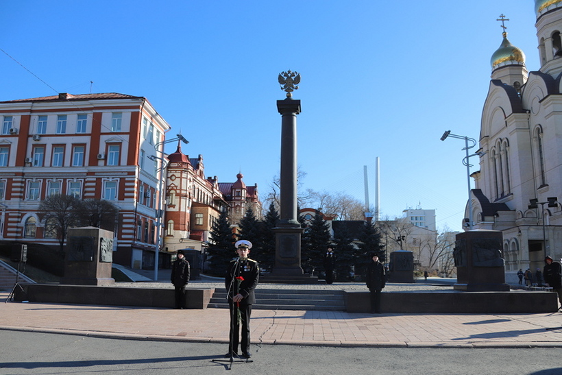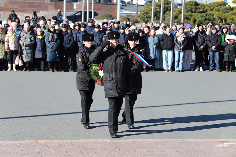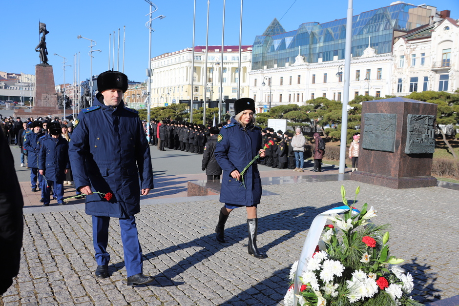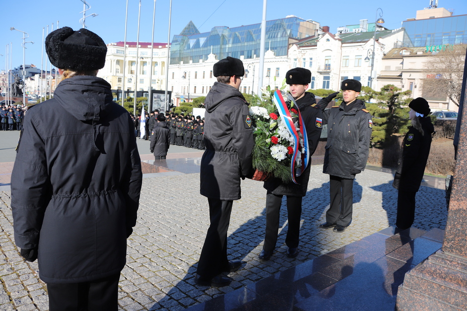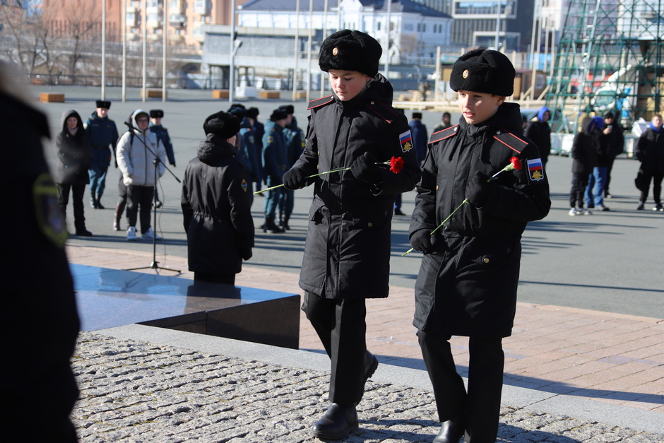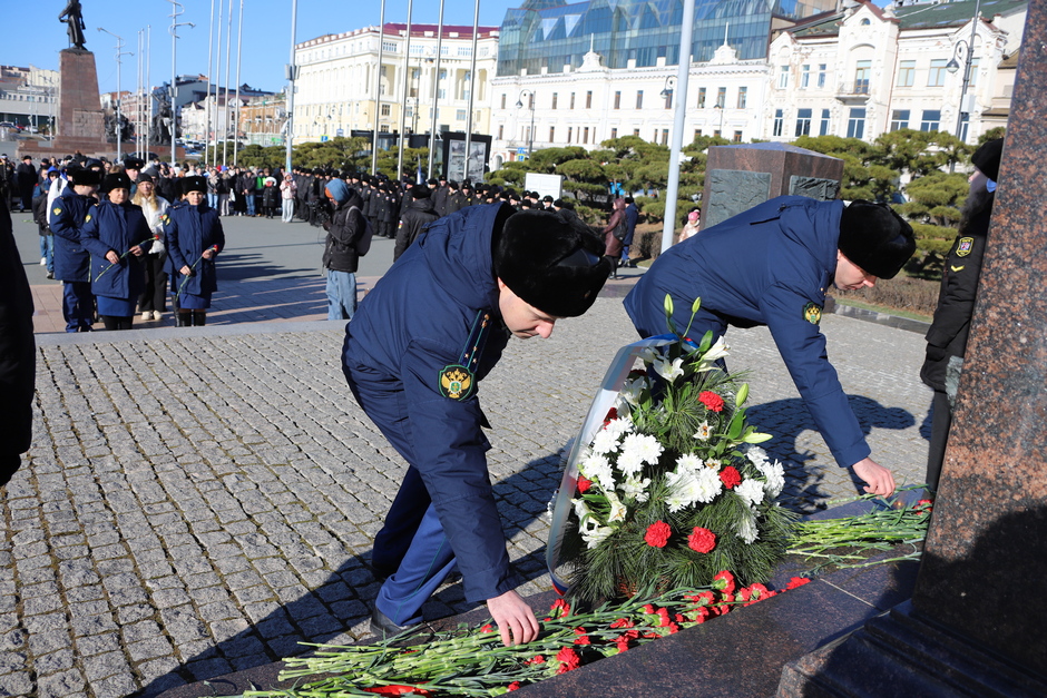 Участники мероприятия минутой молчания почтили память героев, отдавших жизнь за Родину, и возложили цветы к стеле «Владивосток – город воинской славы».