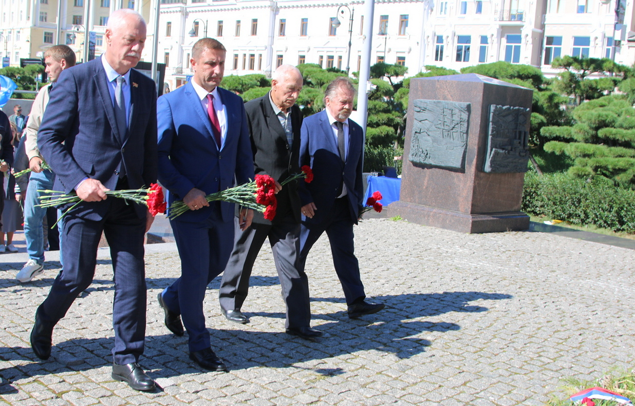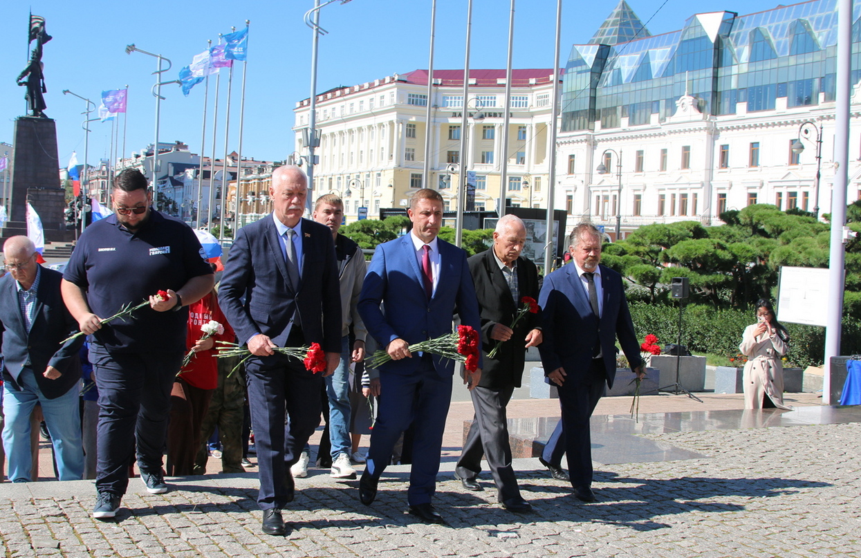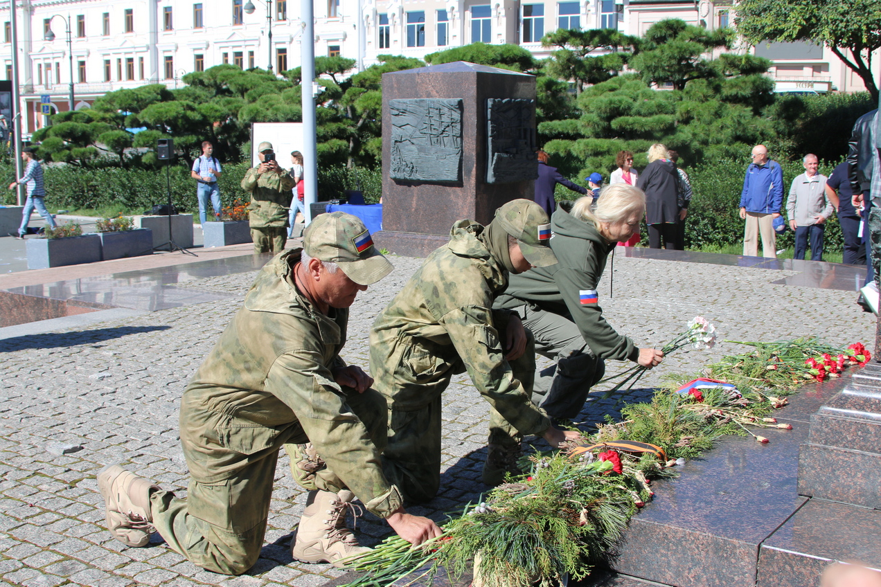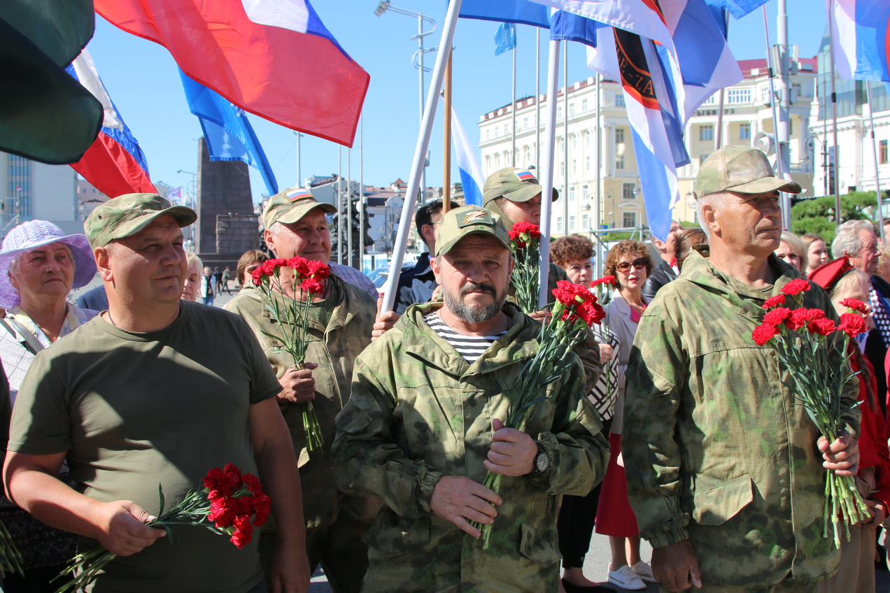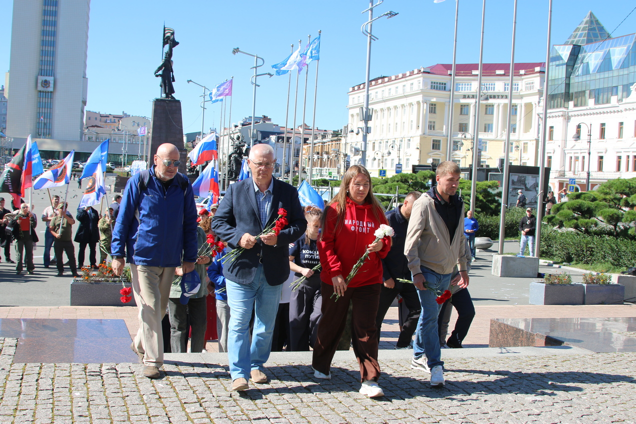 Участники мероприятия выразили благодарность тем, кто боролся за свою родину, кто с оружием в руках защищал интересы России, безопасность и благополучие граждан страны, почтили память павших минутой молчания и возложили цветы к стеле «Город воинской славы» Владивосток.