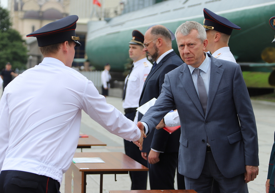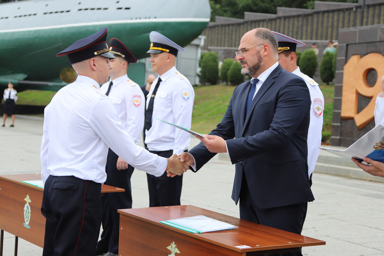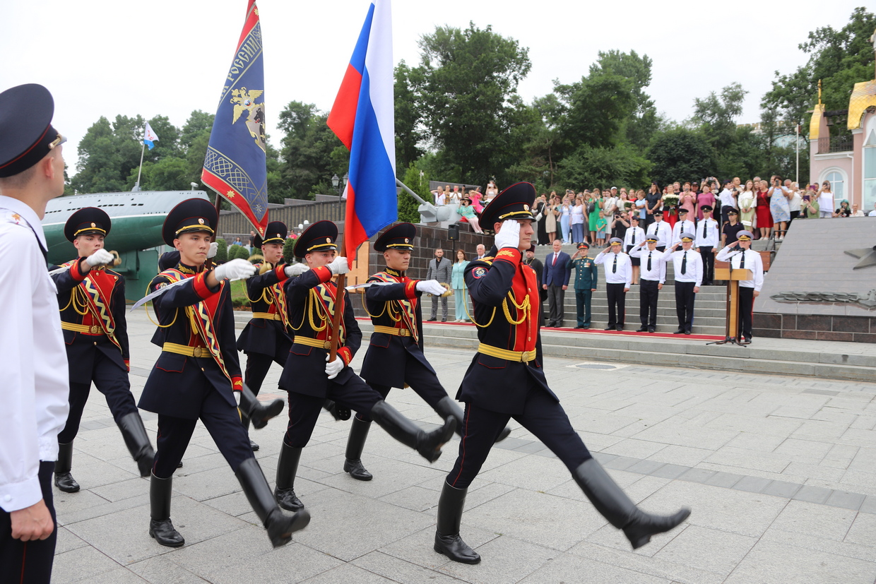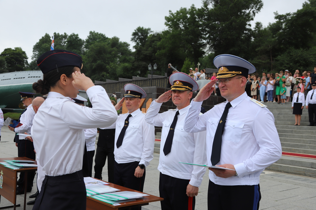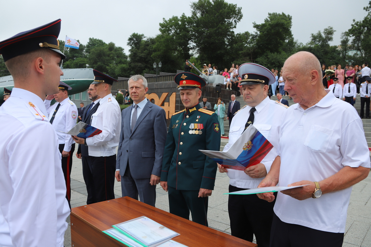 В торжественной церемонии выпуска слушателей пятого курса очной формы обучения Владивостокского филиала ФГКОУ ВО «ДВЮИ МВД России имени И.Ф. Шилова», которая состоялась у мемориального комплекса «Боевая слава Тихоокеанского флота» 1 августа, приняли участие руководители органов государственной власти и местного самоуправления, представители Владивостокской епархии Русской Православной Церкви, общественных организаций, ветераны, родственники выпускников.
