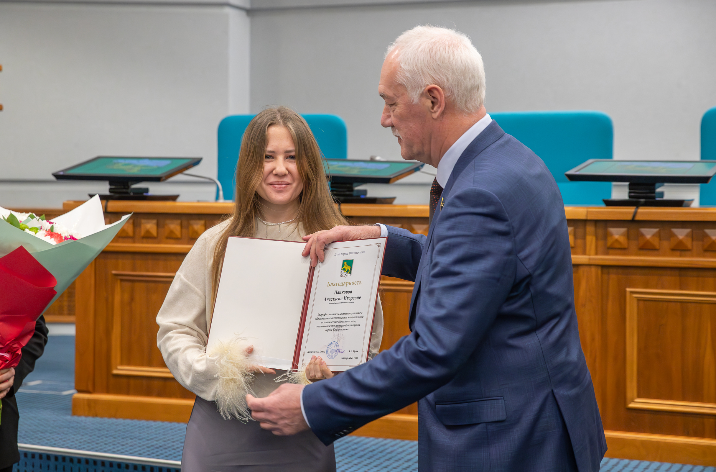Благодарностью Думы города Владивостока за профессионализм, активное участие в общественной деятельности, направленной на достижение экономического, социального и культурного благополучия города Владивостока, награждены Андрей Суворов и Анастасия Панкова. За активную гражданскую позицию, высокие достижения в профессиональной деятельности и поддержку общественных мероприятий Благодарностью местного отделения партии «Единая Россия» награждены Александр Сапогов и Ольга Чиркина.