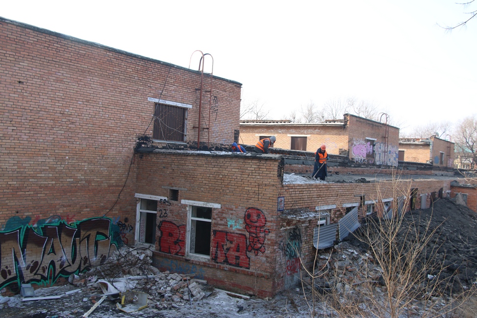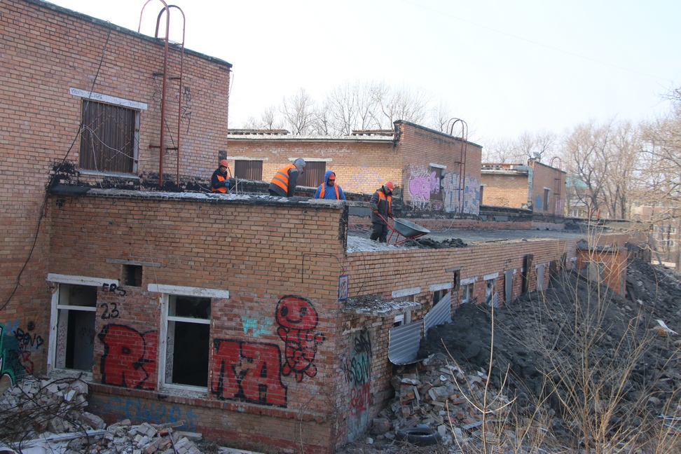 Первым объектом осмотра стал детский сад на улице Постышева,7. В настоящее время объект огорожен забором, на территории работает техника, ведутся работы по ремонту кровли.
