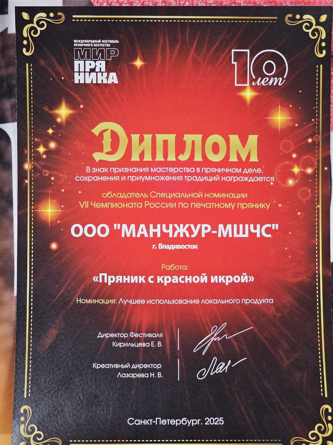 Также Андрей Брик поздравил с победой на юбилейном X международном фестивале «Мир пряника» члена Общественного совета Думы Владивостока, руководителя ММВК «Достояние», ООО «Манчжур-МШЧС» Александра Гетманова. Участниками юбилейного фестиваля в Санкт-Петербурге стали порядка 350 человек из более чем 160 городов, по итогам конкурса компетентное жюри оценило свыше 400 уникальных экспонатов. Пряник ручной работы из Владивостока, изготовленный по оригинальной рецептуре, отмечен на фестивале Дипломом чемпионата России по печатному прянику в специальной номинации «Лучшее использование локального продукта».