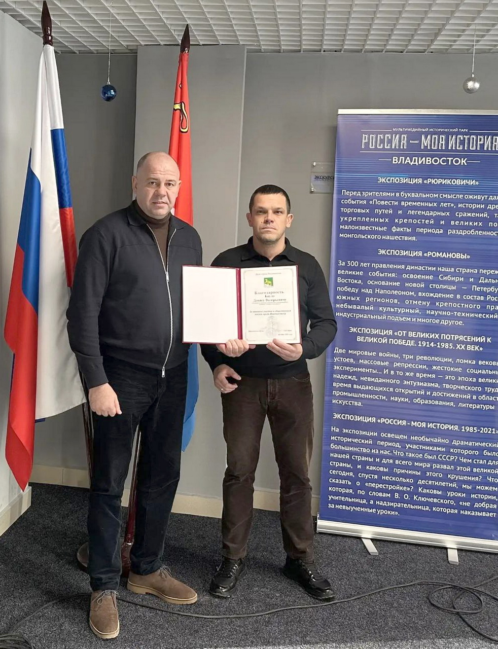 Награды Думы города Владивостока вручены активным общественным деятелям, чья работа способствует социальному и культурному процветанию Владивостока, в их числе заместитель директора по общим вопросам автономной некоммерческой организации «Приморский культурно-исторический центр» Вадим Хрущев, который эффективно способствовал в организации в историческом парке «Россия – моя история» современных экспозиций, фестивалей, круглых столов, курсов повышения квалификации.