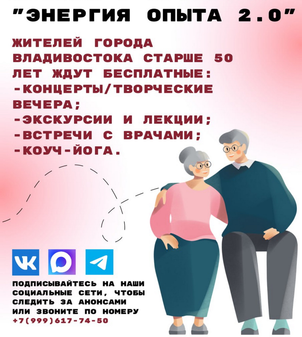 «Проект «Энергия опыта 2.0» ― это не просто цикл мероприятий, а возможность для представителей старшего поколения оставаться вовлеченными в общественную жизнь города, развиваться, общаться и чувствовать себя нужными. Мероприятия проекта бесплатны и открыты для всех желающих, причем большинство событий пройдут в Первореченском районе, что удобно для жителей всего Владивостокского городского округа. Организаторы приглашают горожан возрастной категории «50+» присоединиться к проекту и стать частью дружного сообщества», ― отметила депутат Думы города Владивостока Вероника Сипачева.