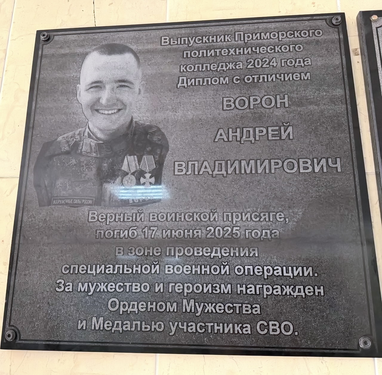 В Приморском политехническом колледже торжественно открыли мемориальную доску выпускнику Андрею Ворону, который героически погиб при выполнении боевых задач в зоне специальной военной операции в июне 2025 года. Указом Президента РФ Андрей Ворон посмертно награжден Орденом Мужества, медалью участника СВО.