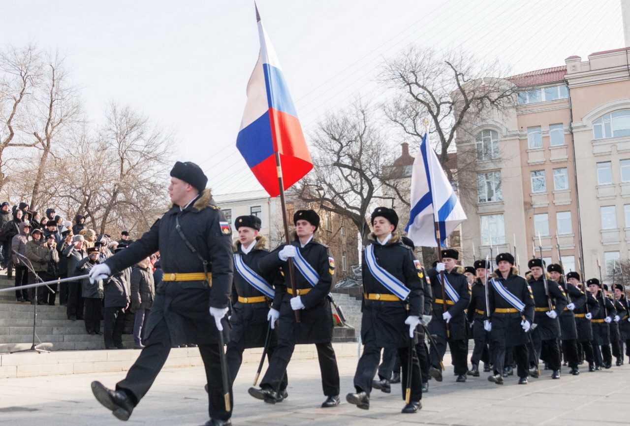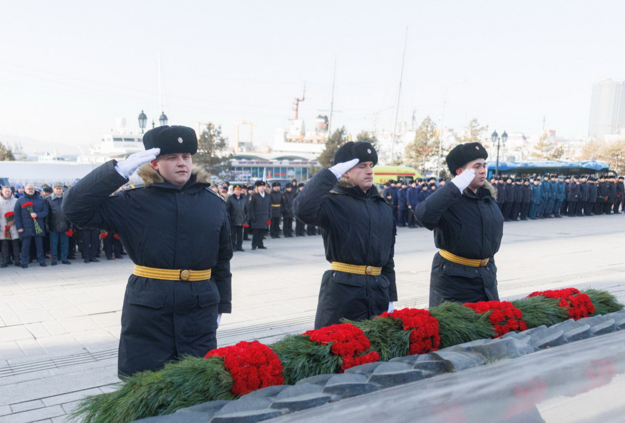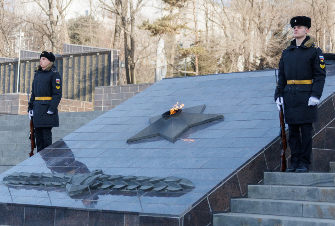 В День защитника Отечества перед мемориалом «Боевая слава ТОФ» торжественным маршем прошла рота почетного караула. Собравшиеся почтили память защитников Отечества, возложили цветы к Вечному огню, а также к памятнику морским пехотинцам Тихоокеанского флота.