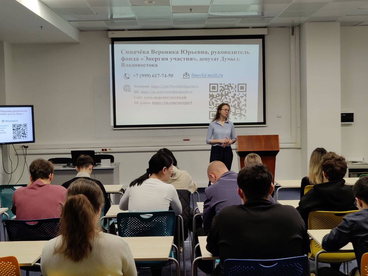 Депутат Думы города Владивостока Вероника Сипачева встретилась с активными студентами ДВФУ, чтобы поделиться опытом депутатской работы в избирательном округе и рассказать о деятельности депутатов и Думы города Владивостока в целом, а также о том, как стать депутатом и об избирательной компании.