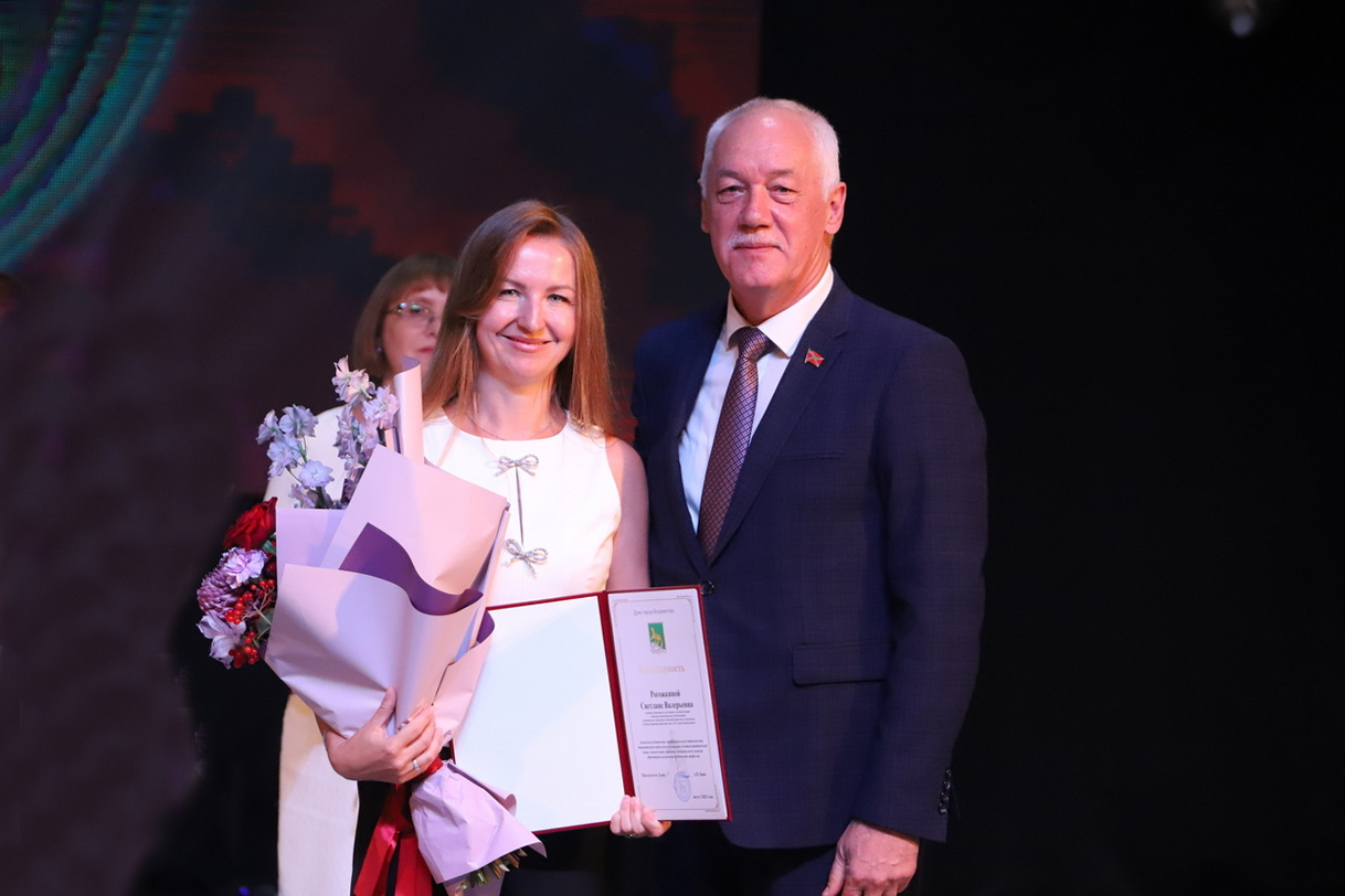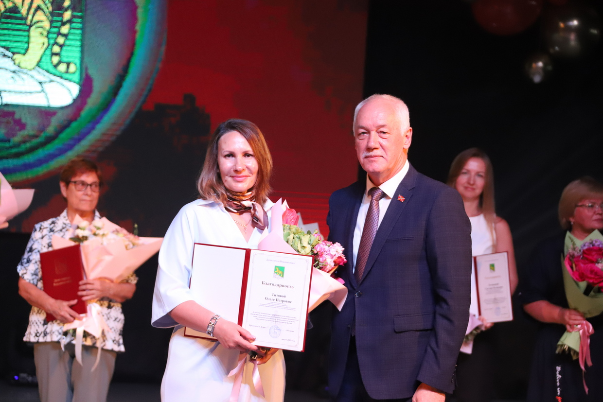 Почетной грамотой Думы города Владивостока награждены учитель физической культуры школы № 13 Александр Валянин, учитель начальных классов школы № 63 Инна Понихидина, педагог дополнительного образования Центра развития творчества детей и юношества «Надежда» Первореченского района Ольга Рыжова, учитель истории и обществознания школы № 72 Наталья Шпакина, учитель русского языка и литературы школа № 6 Ирина Юн. Благодарностью Думы города Владивостока награждены учитель английского языка школы № 13 Надежда Виниченко, учитель музыки школы № 63 Мария Власова, учитель изобразительного искусства школы №57 Ольга Королёва, советник директора по воспитанию и взаимодействию с детскими общественными объединениями школы №83 Светлана Рогожкина, педагог-организатор Центра образования «Вектор» Елена Сугробова, учитель начальных классов, учитель русского языка и литературы школы №72 Ольга Титова.