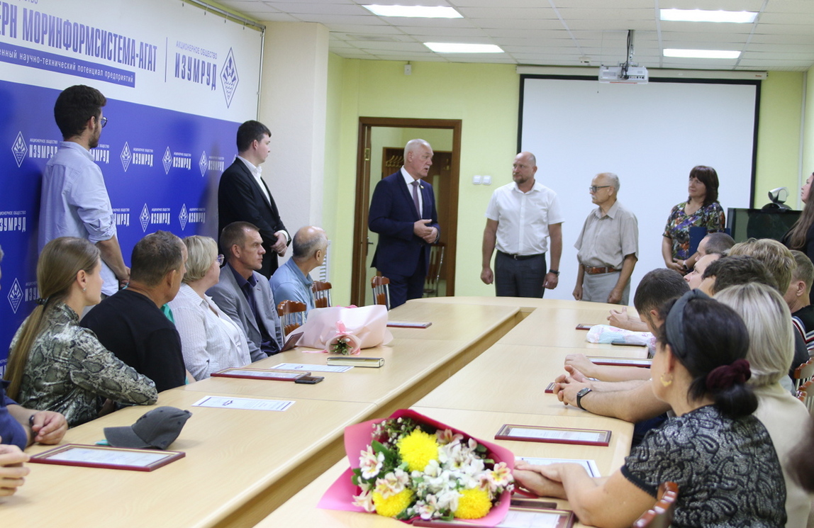 Генеральный директор АО «Изумруд» Станислав Медведев вручил работникам награды АО «Концерн «Моринформсистема-Агат», в состав которого входит предприятие.