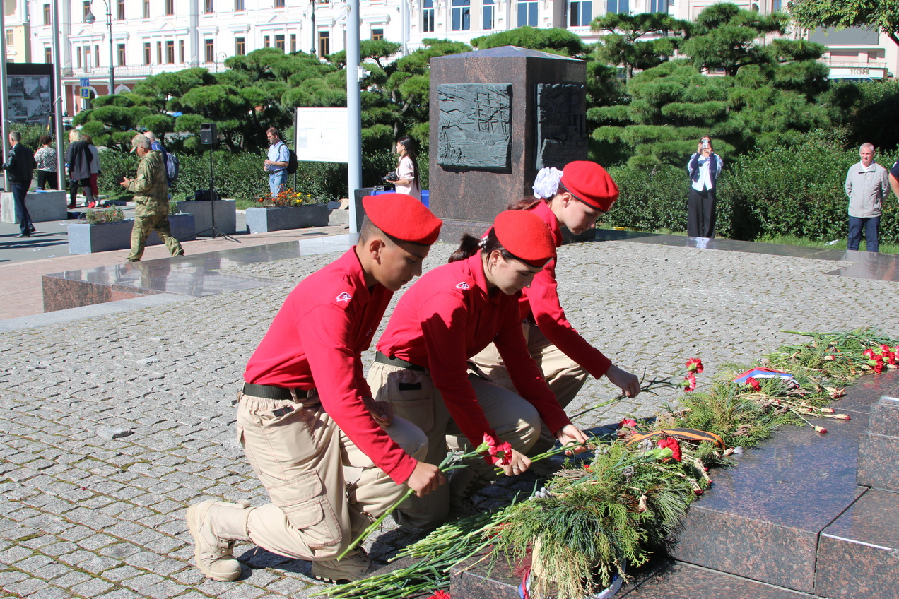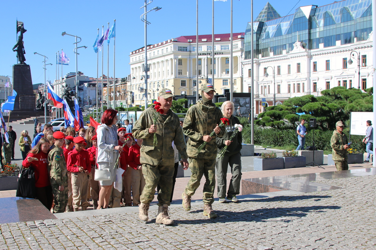Участники мероприятия выразили благодарность тем, кто боролся за свою родину, кто с оружием в руках защищал интересы России, безопасность и благополучие граждан страны, почтили память павших минутой молчания и возложили цветы к стеле «Город воинской славы» Владивосток.
